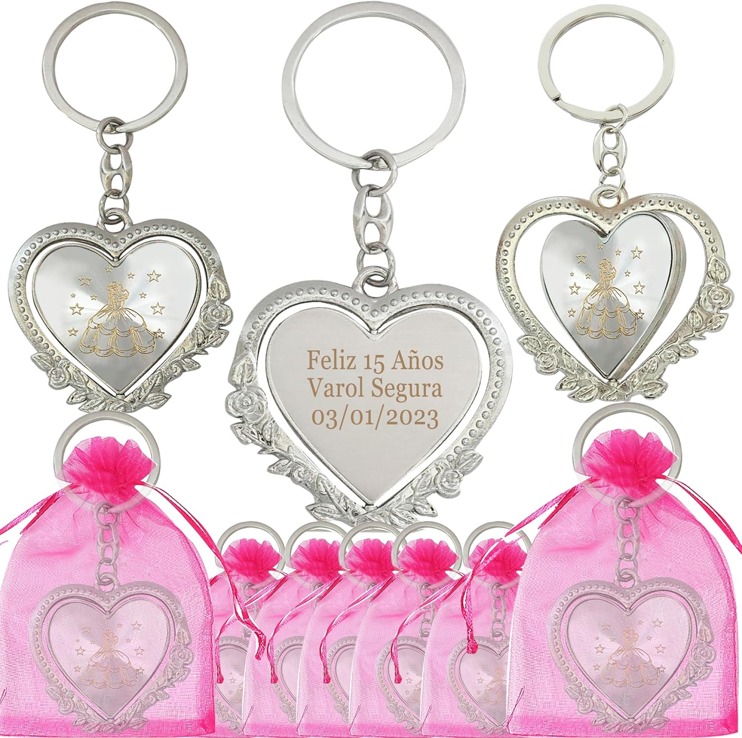 12 Piece Personalized Beautiful Quinceanera Heart Key Chains are the Perfect Thank you gift for your guests. Pink, Silver, Red, and purple color you can select. Princess theme party favors. Quinceañera, Custom Birthday Keychains, Personalized Gifts, Birthday Party Favors, Mis Quince Años. Beautifully engraved key chains will be an excellent quinceanera, sweet 15, sweet 16, 16 Birthday, Mis 3 anos, princess Cinderella theme favor, gift or memento at your event and is custom made with the details of your special day. Each keychain comes in the organza bag. Personalize with three lines of text in the font of your choice. 12 Piesas Elegante Llavero personalizado perfecto como recuerdo de Quinceañera,Presentacion, Cumpleaños. you can keep them as souvenirs, or pack them up and then share them with friends and families . Celebrate Girl's 15th Birthday:
