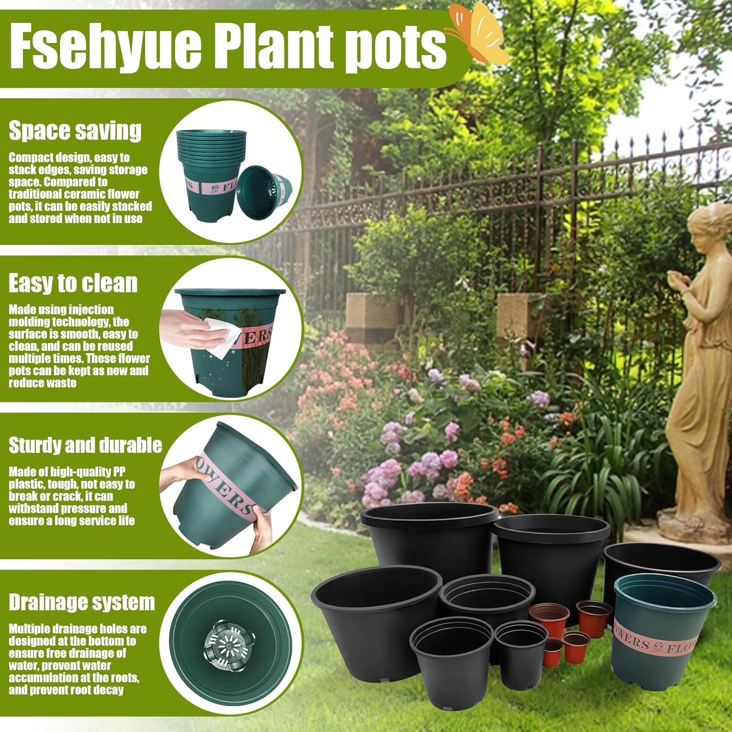 14 Inch Nursery Pots (10-Pack) 7 Gallon Plant Pots Thickened Premium Injection Molded Plastic Pot with Drainage Holes Suitable for Indoor Outdoor Home Office Planters Decor Container GreenSpecifications:Material: PlasticColor: GreenSize: 14.29"top diameter x 10"bottom diameter x 13.39"heightCapacity: 7 gallonsPlanter form: Nursery potFeatures:The plant basin is made of reinforced PP material, durable and structurally stable, with strong load-bearing capacity, and is not easily deformed or damaged. Its surface is smooth and easy to clean, and can be used multiple timesThere are drainage holes at the bottom to enhance ventilation and drainage, which not only keeps the soil moist but also discharges excess water. Can help seedlings and plants survive and grow vigorouslyThe surface of the gallon basin is easy to grip, and the top edge is reinforced, making it easy to transport when filled with soil and plants or when wet or rainyThis seedling pot is suitable for various plants and can transplant seedlings and plants of different growth cycles, which is beneficial for plant reproduction. It can also be used as a transitional pot for indoor and outdoor plants