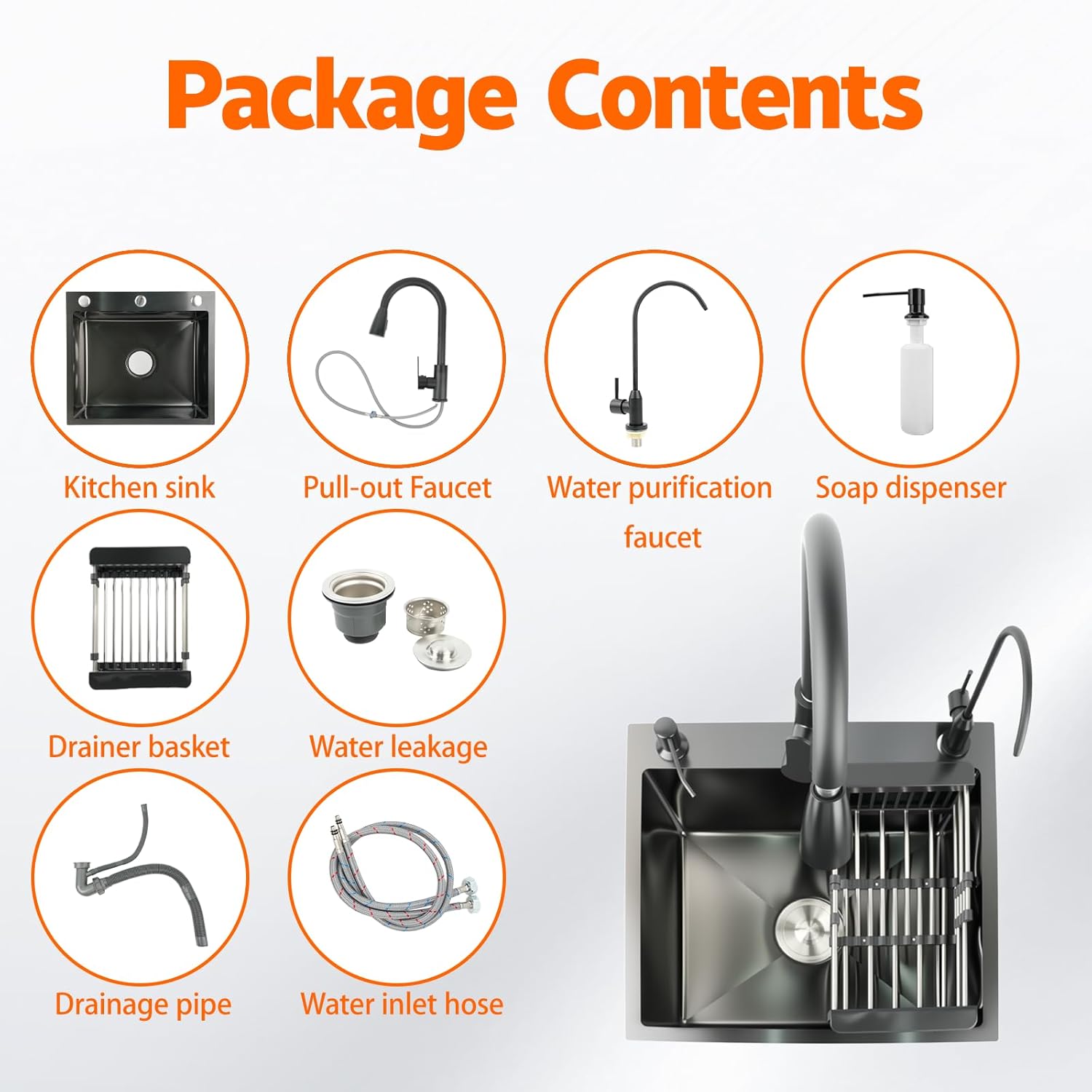 Why Choose Our Kitchen Sink System?A complete professional-grade solution combining premium materials with intelligent design for superior functionality.Key Features:All-Inclusive Kit Comes with faucet, purifier, soap dispenser, and hardwarePremium Black Stainless Steel Commercial-grade fingerprint-resistant coatingOptimized Drainage Design Deep basin with X-pattern groovesMultifunctional Workspace Includes oversized extendable colanderAccurate Fit Guide Measures 19.7"Lx17.7"x7.3"HWhy It's Essential:Provides complete setup packageEnsures durable, low-maintenance surfaceEnhances cleaning efficiencyBoosts kitchen productivityGuarantees proper installationIdeal for modern kitchens requiring a comprehensive sink system that blends premium aesthetics with high-performance functionality for cooking and cleaning tasks.