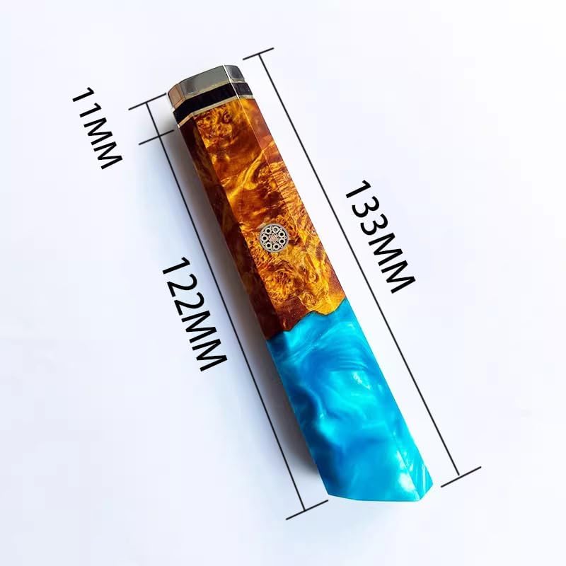Material: stainless steel + white copper + acrylic + resin + burl wood; (polished and polished, ready for installation and use upon receipt)Size: Overall length 133MM, insertion depth of handle 76.5MM, head 22.8*17MM, jack 11*2.1MM, tail 27*21.3MM(See the detailed picture. Before purchasing, please check whether the handle size matches your blade.)Weight: about 76G/PCQuantity: 1PCNote: Since it is a natural material, the surface texture and color will change randomly, please refer to the goods received.