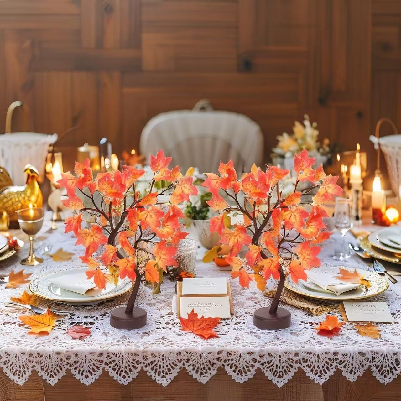 2 Pack Artificial Autumn Maple Tree with 24 LED Lights, Battery/USB Powered Thanksgiving Table Lamp, Fall Harvest Home Decor for Wedding Party Indoor Outdoor