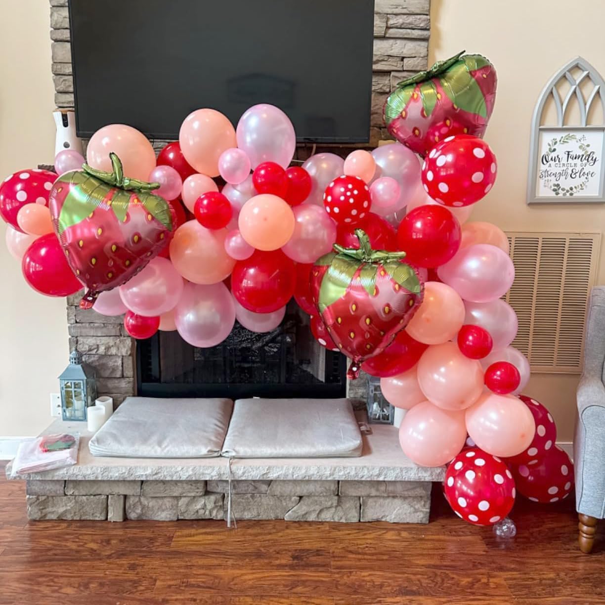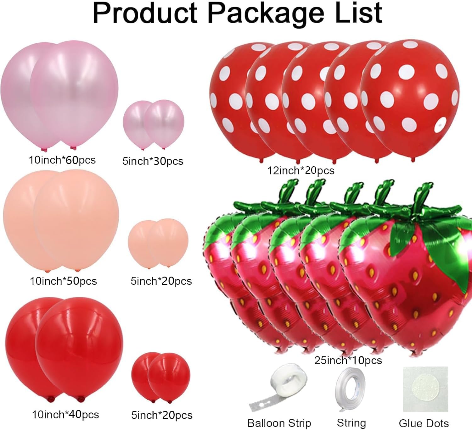 How do you install a girl sweet strawberry balloon arch kit? 1>Inflate the balloons, tie a knot in each balloon separately 2>Put the balloon's knot through the holes of plastic strips 3>Use the dots glue to stick balloons by balloons as you like 4>Then hang the balloon garland on the wall, window, door or somewhere you like. The package contains 2 pack strawberry balloon arch kit. Each pack supplies: -pearl pink balloons:5inch*15pcs,10inch*30pcs -peach balloons:5inch*10pcs,10inch*25pcs -red balloons:5inch*10pcs,10inch*20pcs -white dot red balloon:12inch*10pcs -strawberry aluminum foil balloons:5pcs -16ft balloon garland strip-1pc -100pionts of glue dot-5pcs -ribbon-1pcs Our Customer use Occasion below: -strawberry baby shower decorations -sweet girls' birthday party -berry first birthday party supplies -fruit themed party supplies -engagement party decorations -anniversary party decorations -summer party decorations -garden party decoraations -wedding party decorations -wedding Receptions party decorations Tips: Due to the light and screen difference, the item's color may be slightly different from the pictures. Do not use mouth to blow the balloon.