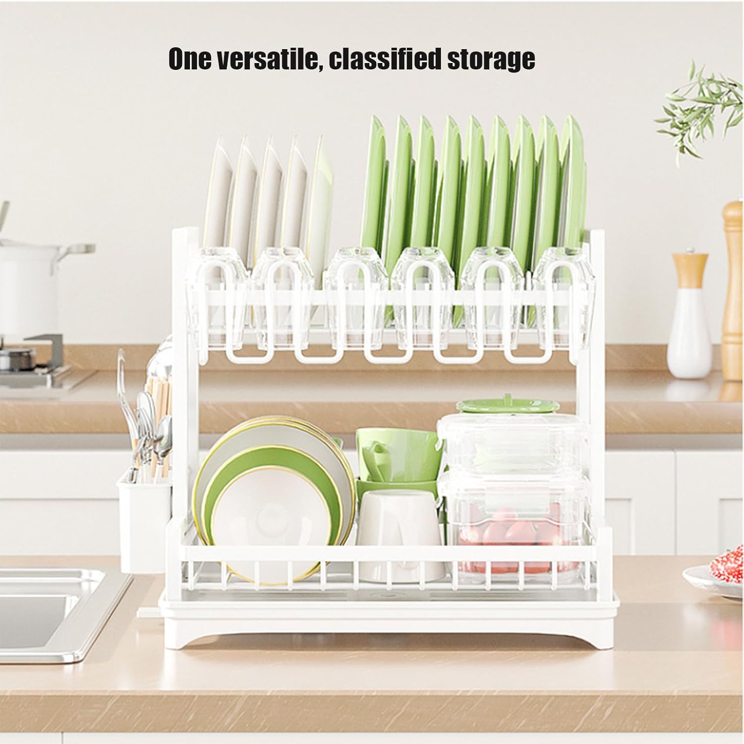 Introducing our 2 Tier Dish Drying Rack, designed to elevate your kitchen organization while adding a touch of modern style. Made from durable carbon steel, this dish drainer rack is both rust-resistant and space-saving, making it an essential addition to any kitchen counter. With dimensions of 42L x 30W x 38H centimeters (16.53 x 11.81 x 14.96 inches), this dish rack efficiently accommodates a variety of kitchenware, including plates, bowls, cups, and silverware. The innovative design features an adjustable drip tray that ensures automatic drainage, keeping your countertops dry and tidy. Perfect for busy households, this 2 tier dish rack helps streamline your post-meal cleanup. Simply place your washed dishes on the rack and let gravity do the work. Its countertop mounting type makes it easy to set up in any kitchen, whether you have a small apartment or a spacious home. The white finish adds a clean, fresh look to your kitchen decor, while its sturdy construction provides stability for all your dishware. Whether you're drying stemmed glasses or everyday dishes, our dish drainer with cup holder is versatile enough to meet all your drying needs. Included in the package is one 2 Tier Dish Drying Rack and an instruction manual for easy assembly. Note that the dimensions provided are manually measured and may have slight variations. Please be aware that we only sell the Dish Drying Rack, and other items shown in the pictures are not included. Upgrade your kitchen with our 2 Tier Dish Drying Rack and experience the convenience of organized drying space, making your daily routines more efficient and enjoyable.
