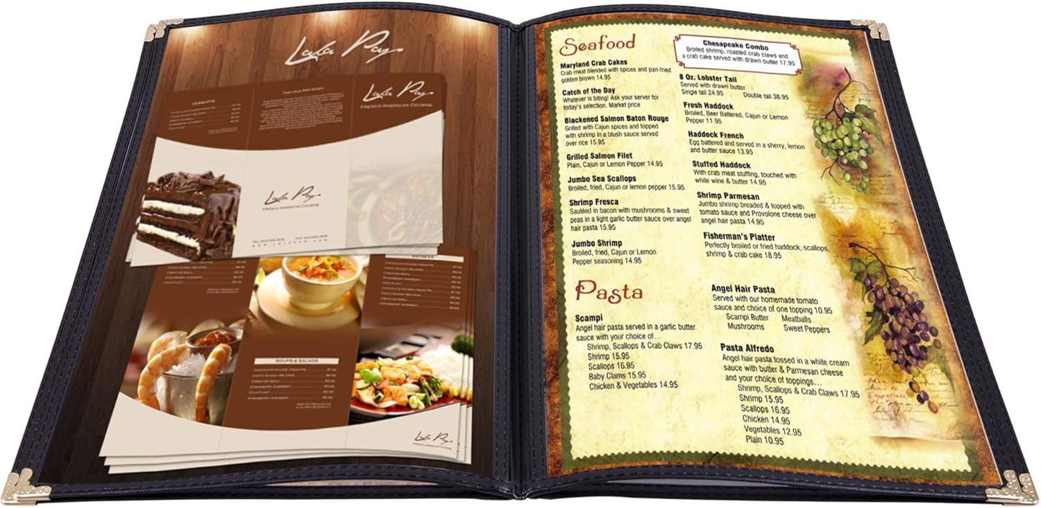 Present your menu with style and durability using these 4-Page / 8-View Legal-Size Menu Covers, designed for restaurants, cafés, bars, and diners that demand a clean, professional look. This bulk 20-pack provides excellent value for busy establishments needing multiple menus or frequent replacements. Each cover holds four double-sided sheets, giving you eight total viewing panels—perfect for displaying appetizers, entrées, desserts, drink lists, specials, and more. Made to fit legal-size 8.5" x 14" papers, these covers feature crystal-clear PVC panels that protect your printed menus from spills, stains, fingerprints, and everyday wear. The reinforced black binding with double-stitched edging ensures long-lasting use, while the protective metal corner guards add strength and prevent fraying. Easy to wipe clean, these covers are ideal for high-traffic environments where menus must remain neat, presentable, and durable.