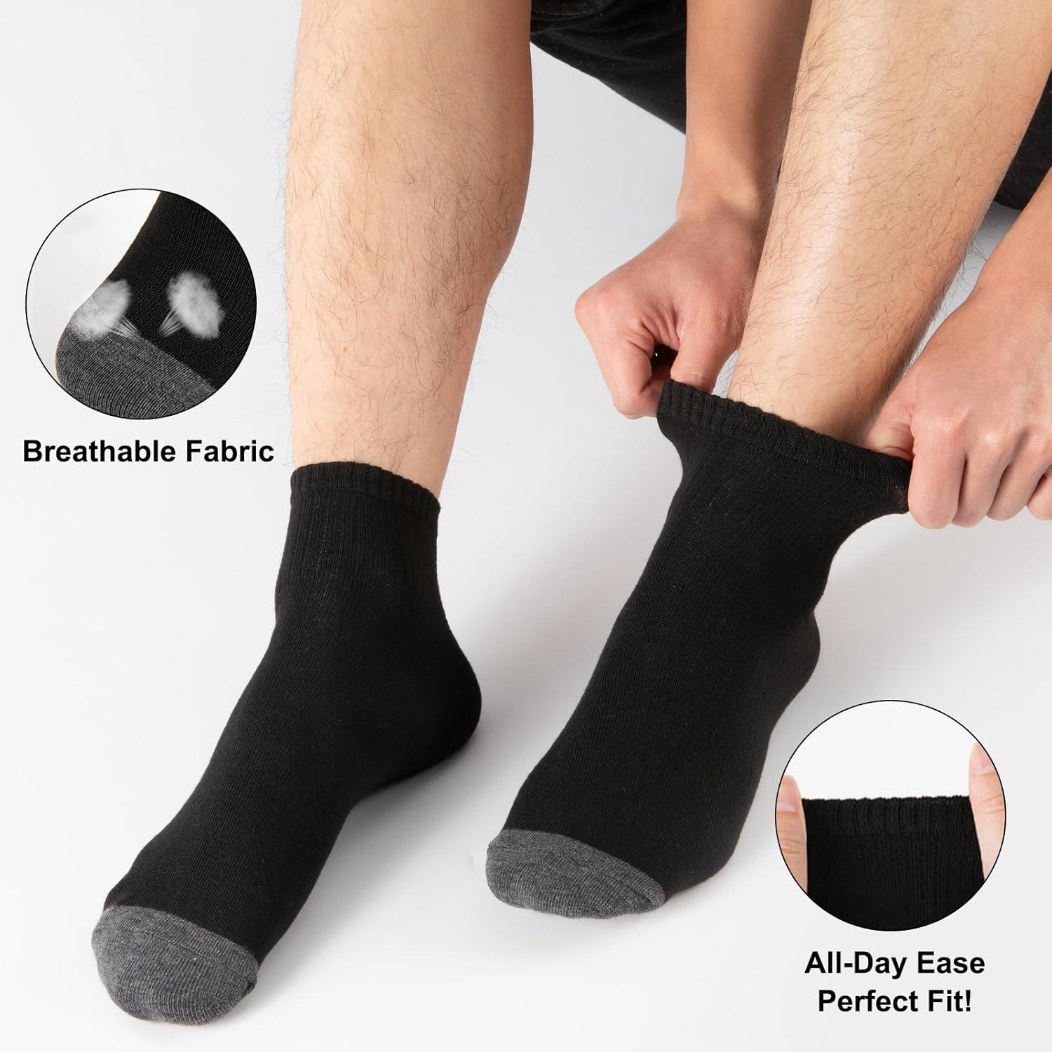 MEN’S QUARTER SOCKS – 20 PAIRS VALUE PACKBreathable Lightweight Moisture Wicking Everyday EssentialFits Men’s Shoe Size 8–12 & 12–16Perfect for Work Boots, Sneakers & Daily WearUpgrade your daily essentials with these mens quarter socks 20 pack, designed for all-day comfort and performance.Made with lightweight and breathable fabric, these quarter length socks mens keep your feet cool, dry, Designed for running, gym, work, walking, and everyday wear. Features classic black and grey colors that go with everything.✅ Moisture Wicking & Quick DryKeeps your feet dry and fresh even during long hours of wear✅ Breathable & LightweightDesigned with airflow in mind for all-day comfort✅ Elastic Cuff – Stay in PlaceSnug fit that prevents slipping without being too tight✅ 20 Pairs Bulk Value PackStock up and save with this budget-friendly multipack