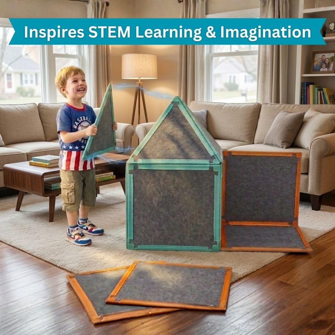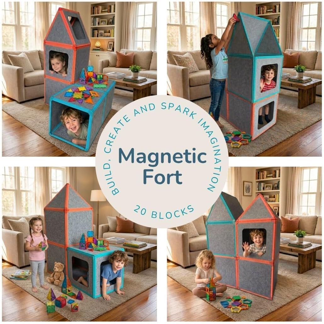 Build Bigger, Play Smarter This 2-in-1 Magnetic Fort Kit + 32 Magnetic Tiles includes 20 panels (10 orange, 10 blue: 13 walls, 4 triangles, 3 windows) for building life-size forts, plus 32 tiles for creative 3D designs. Learn Through Play Encourages STEM skills, creativity, and problem-solving with engaging, screen-free fun for kids ages 3+. Safe, Lightweight & Easy Durable, non-toxic materials with easy snap-together magnets—perfect for little hands and quick cleanup. Perfect Gift Idea An exciting, educational toy that keeps kids building and exploring for hours.