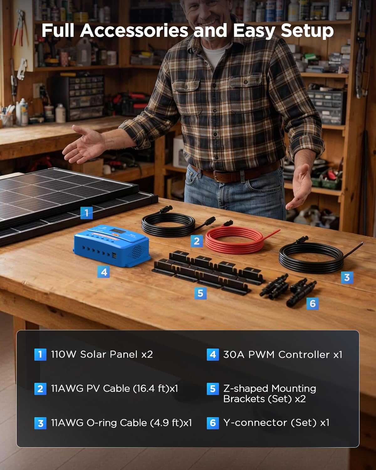 | Included Components | 110W Solar Panel × 2, 11AWG O-ring Cable (4.9 ft) × 1 and PV Cable (16.4 ft) × 1, 30A PWM Controller × 1, Y-connector (Set) × 1, Z-shaped Mounting Brackets (Set) × 2 |