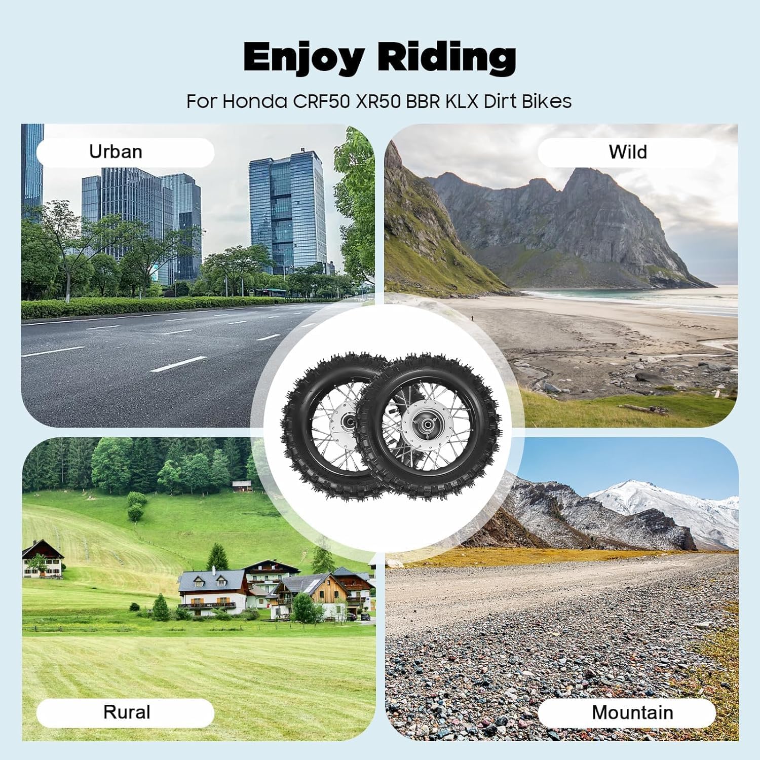 Specifications:Applicable Models: For Honda CRF50 XR50 BBR KLX Dirt BikesModel: 2.5-10Condition: NewMaterial: Alloy Color: Black, SilverInstallation Position: Front, RearWay of Use: Directly ReplacementGross Weight: 8kg/17.64lbsNet Weight: 7kg/15.43lbsPacking Size: 40*40*30cm/15.75*15.75*18.81inchFront Wheel Size: 39.2*6.5cm/15.43*2.55inchRear Wheel Size: 40*6.5cm/15.74*2.55inchAperture Size: 1.2cm/0.47inchFits (As a Reference):For Honda CRF50 XR50 BBR KLX Dirt BikesPackage Included:1 x Front Wheel1 x Rear Wheel1 x Chain1 x Chain PlateAll Accessories for InstallationHighlights:Brand New, With High QualityDirectly ReplacementSafe DrivingOblique Meridian DesignLarge Pattern, Good Slip ResistanceStrong GripWear-resistant and Non-slipAlloy Material, Sturdy and DurableFine WorkmanshipLong Service LifeNotes:1. We strongly recommend professional installation. Please contact us if you have any questions.2. Please allow the slight color difference caused by the shooting light and 1-3cm error due to manual measurement, and make sure you do not mind before you place the order.3. Please check whether the tire pressure is normal before riding, pay attention to the road conditions when driving, and slow down.