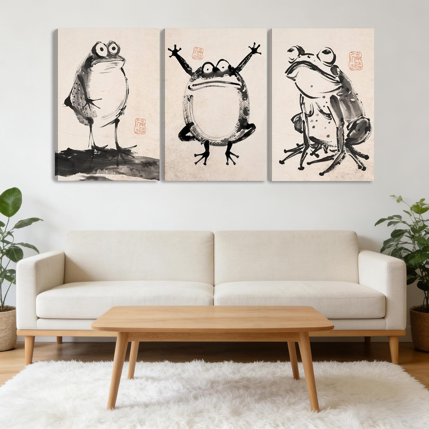 3 PCS 2D No Texture Japanese Ink Style Canvas Wall Art Watercolor Frog Painting Poster White and Black Frog Wall Decor Pictures for Living Room Bathroom Bedroom Home Decoration 12*16 in ( Stretched Canvas on A Wooden Frame)