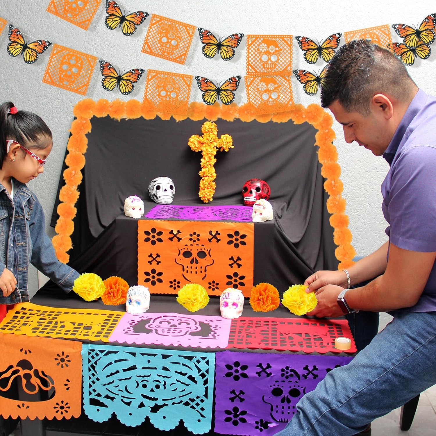 Features: Thoughtful Gifts for Loved Ones: These decorations make practical and heartfelt gifts for friends and family who appreciate special decor or are planning themed parties. By sharing this set, you convey festive blessings and good intentions, making it an ideal choice for gift-giving during the holiday season. Easy to Apply and Set up: Equipped with plastic needles for easy stringing, setting up your decorations is a breeze. They can be effortlessly hung or moved, providing a convenient experience for both indoor and outdoor apply. This ease of setup ensures that you can focus on enjoying your celebration without hassle. Specifications: Material: Felt and plastic Color: Orange, yellow Size: Mexican Dia De Los Muertos banner about 16x14cm/6.3x5.5inch Package includes 2 x Marigold wreaths 40 x Marigold flower heads and stems 2 x Day of The Dead party banners (Each set includes 6 skull banners and 7 monarch butterflies) Notes: Manual measurement, please allow slight errors on size. The color may exist a slight difference due to different screen displays