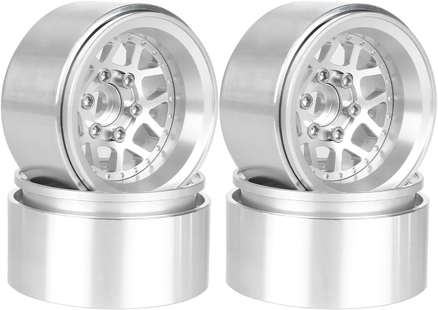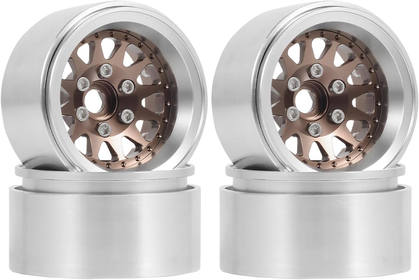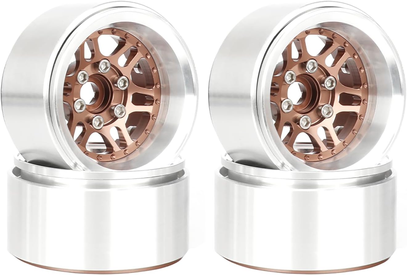 Feature: CNC aluminum machined Color Anodized,Looks Nice 1.9 beadlock design, don't need to glue Negative offset -10mm, widen wheel spacing and provide better stability Lightweight and durable construction, offer a perfect balance between strength and weight, enhancing the overall agility Specification: Material: Aluminum Offset: -10mm (-0.39in) Outer Diameter: 56.5mm (2.22in) Inner Diameter: 44mm(1.73in) Thickness: 30.5mm (1.20in) etc Drive Hex: 12mm (0.47in) Center Hole: 7.0mm(0.27in) Weight: 90g/pc Color: Black/Silver/Bronze/Gun grey Package include: 4 x RC Car 1.9 beadlock wheels