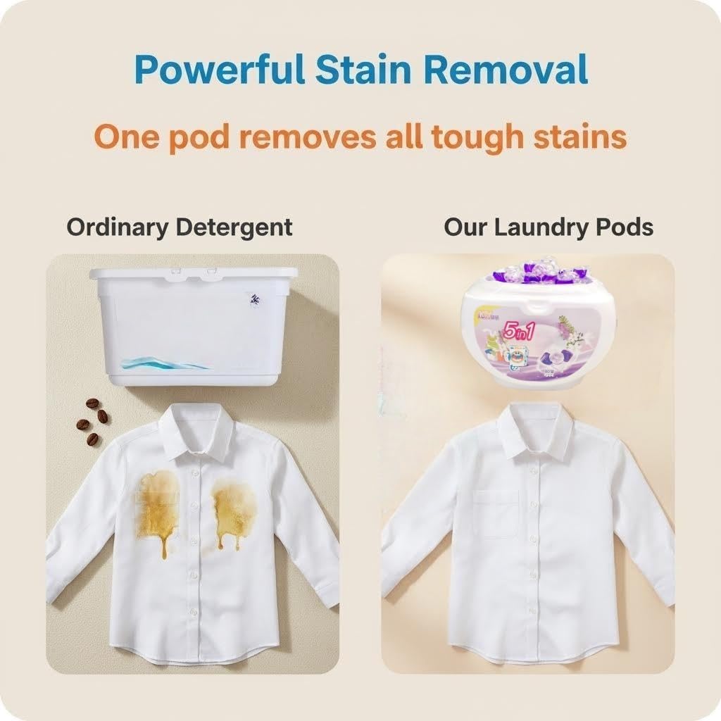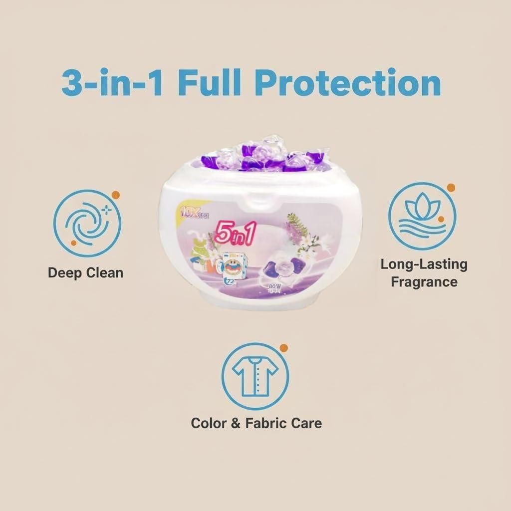 Upgrade your laundry routine with these 5-in-1 White Musk Laundry Detergent Pods, designed to deliver a powerful, all-in-one clean with every wash. Each pod combines deep cleaning, fabric softening, color protection into one convenient, easy-to-use pod. The built-in scent beads release a fresh, long-lasting white musk fragrance that keeps your clothes smelling great long after the wash cycle ends. these pods are safe for all fabric types and compatible with all washer styles, including high-efficiency machines. Simply toss a pod into the drum before adding your laundry — no measuring, no mess. Each package contains 80 pods , making it a practical choice for busy households. The compact packaging measures , so it stores neatly in any laundry space. Whether you're tackling everyday loads, these detergent pods provide a thorough, reliable clean while keeping your fabrics looking and feeling their best.