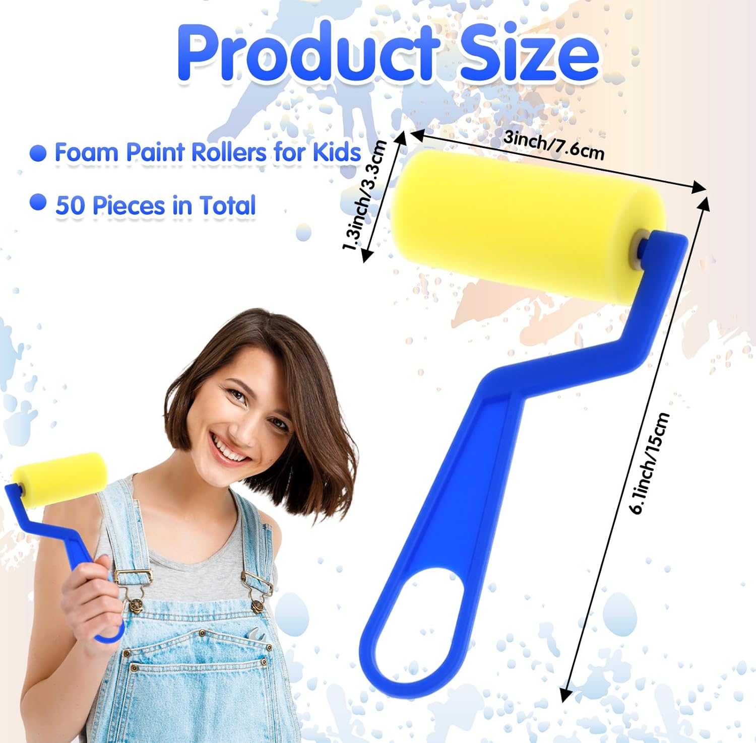 Practical Reusable Design: the sponge rollers for painting are reusable and easy to hold, the handle can help you work without getting your hands dirty, can be easily washed and applied multiple times, allowing you to save time and reduce wasteVarious Functions in Daily Life: the paint roller craft can be applied for various purposes, including painting windows, doors, furniture, and even decorating crafts, adding fun and versatility to your daily life and workSpecifications:Material: Sponge, ppColor: BlueSize: about 6.1 x 1.3 x 3 inches/ 15.6 x 3.3 x 7.6 cmPackage includes:50 x Foam Paint Rollers with handlesNotes:Manual measurement, please allow slight errors on size.The color may exist a slight difference due to different screen displays.