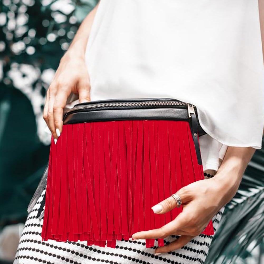 DELORIGIN Suede Fringe Tassel Trim Material: Velvet Suede Size: Length: 5 meters (5.4 yards); Width: 15.4 centimeters (6 inches). Color: Red Our velvet suede fringe trim is of sufficient length to meet all your daily sewing and decoration needs. It comes in rich colors and excellent materials and can be used for various DIY sewing needs such as clothing, curtains, handbags, boots, long skirts, etc.