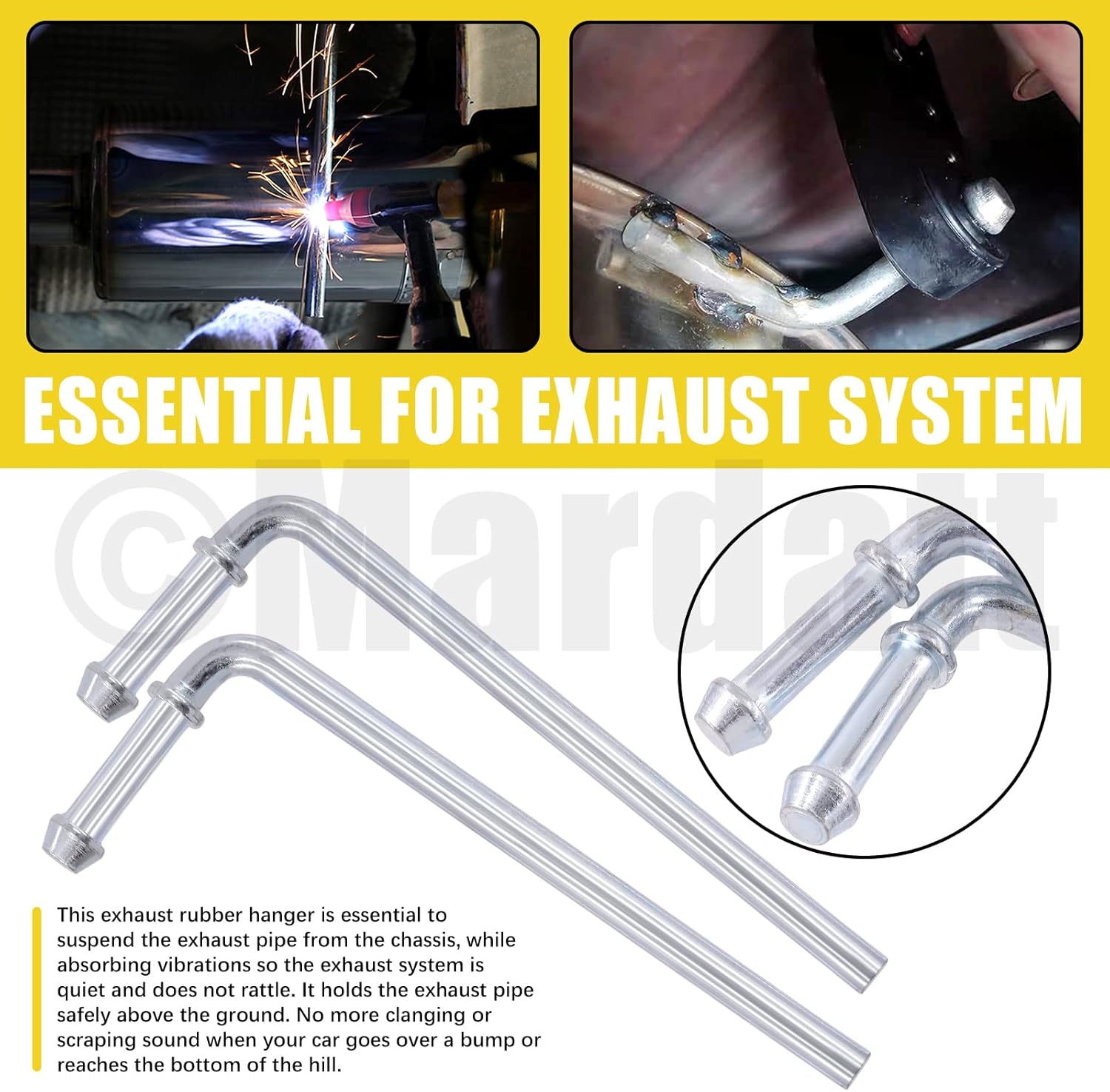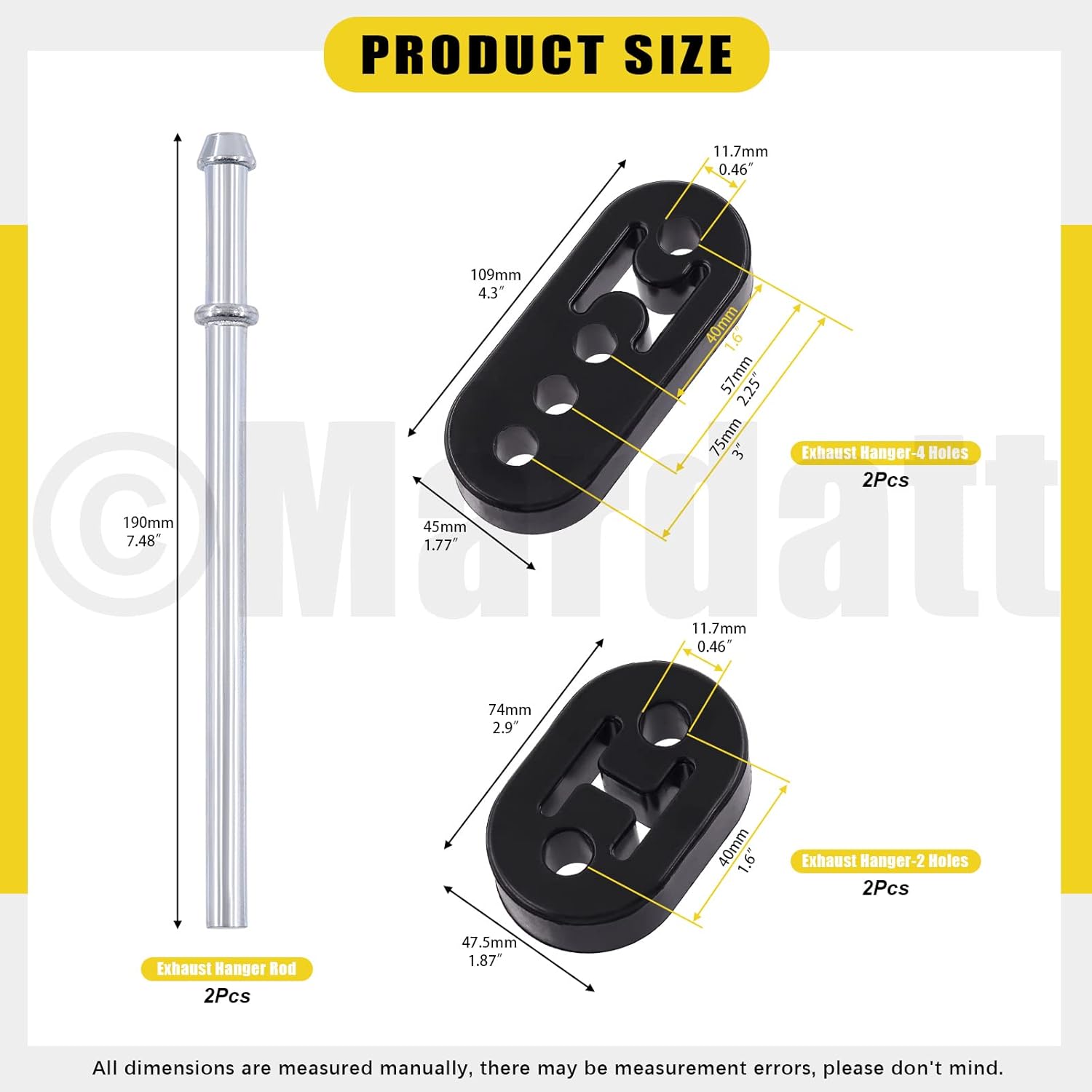 Mardatt 6 Pcs 2/4 Holes Exhaust Hanger Rubber Muffler Hanger with 90 Degree Exhaust Hanger Rod, Insulator Muffler Bracket Mount for Car Truck Jeep [Product Specification]: ☛Material: rubber & mild steel ☛Dimension: ① The 4-holes muffler mount: 4.25”×1.73”×0.9”/108mm × 44mm × 23mm (L*W*H); Hole Diameter: 0.44”/ 11mm. ② The 2-holes muffler mount: 2.9” × 1.9” × 0.8”/73mm ×47mm × 20mm ( L*W*H); Hole diameter: 0.47”/11mm. ③ The length of exhaust ranger rod is about 7”/178mm. Temperature Range: -4℉ to 248℉ Color: black [Why Choose Us]: ☛ Huge Function: absorb vibrations, better secure the exhaust and reduce vibration. ☛ Universal Fit: Fits with most cars. Widely applied in car, jeep, SUV, truck, ect. ☛ Reliable Service: 12 hours quick-response after-sale service.Pls feel confident purchase them. [Package Include] 2pcs------2 hole muffler exhaust hanger 2pcs------4 hole muffler exhaust hanger 2pcs------ 90° bend exhaust hanger rodtotally 6pcs