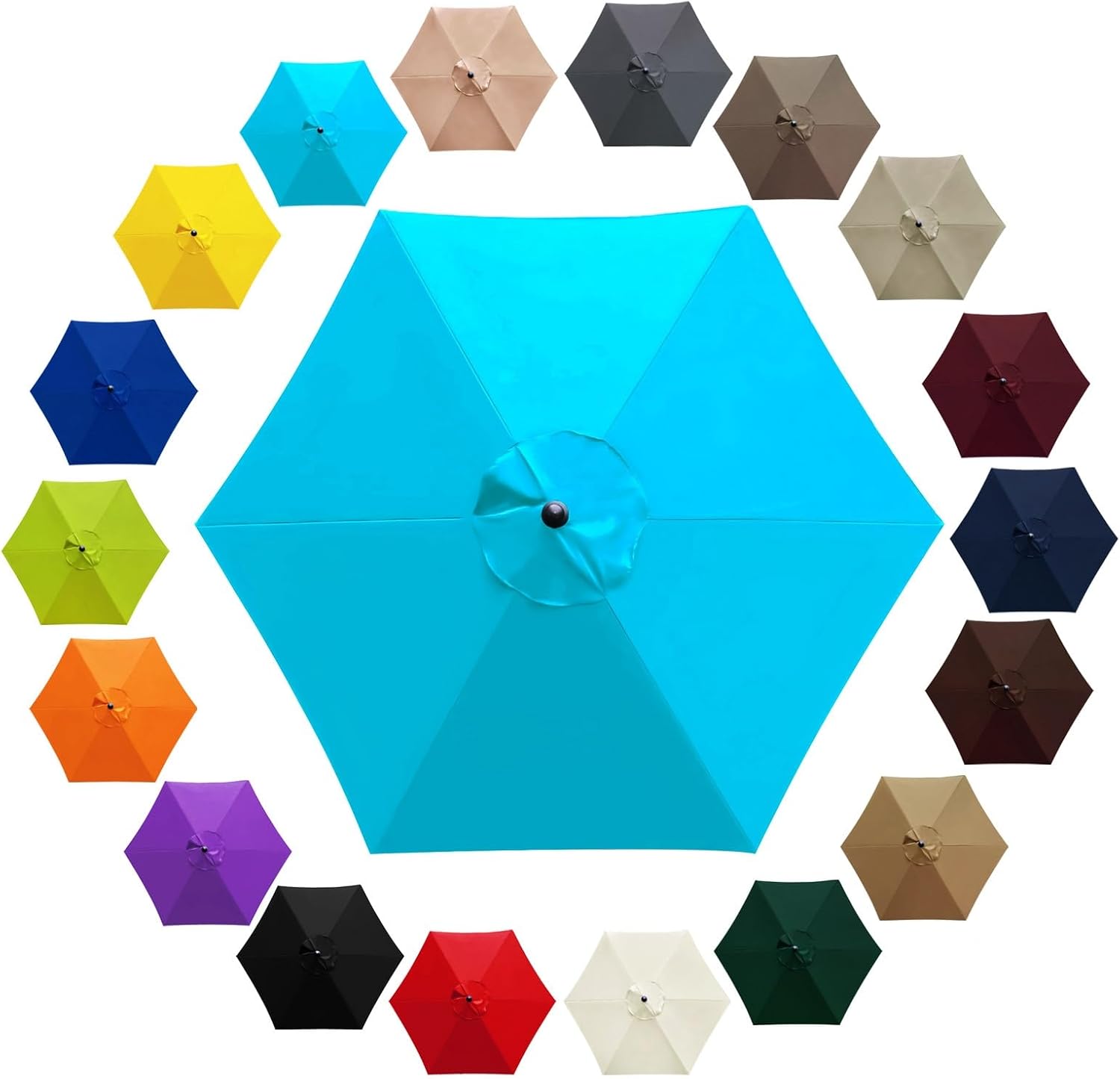 The canopy is made of polyester, tear easily like natural fibers. It also has a to protect you from harmful UV rays. Ventilation holes in the top help air flow and prevent the parasol from being pulled up by the windUV blocking umbrella canopy covers is made of thick canvas and tightly woven to provide ample shade, fade resistance, UV protection, and water resistance.Features: 1. Made of polyester fabric, waterproof, UV protection, quality material can be used for many years.2. Revive your look with a new replacement umbrella canopy, sure to catch the eye at your next party, holiday, neighbor or everyday beautiful look.Allows you to add the perfect shaded area to your yard, to enjoy cool sunshade from sunrise to sunset.Specification:Name: Outdoor Umbrella CanopyMaterial: Polyester FiberColor: Black, Red, White, Dark Green, Khaki, Brown, Dark Blue, Dark Red, Beige, Light Brown, Grey, Champagne, Lake Blue, Yellow, Sapphire Blue, Grass Green, Orange Color, PurpleSize: 2m/6.6ft, 2.5m/8.2ft, 2.7m/8.9ft, 3.0m/9.8ft, 6 ribsPackage content: 1× Umbrella Replacement Canopy