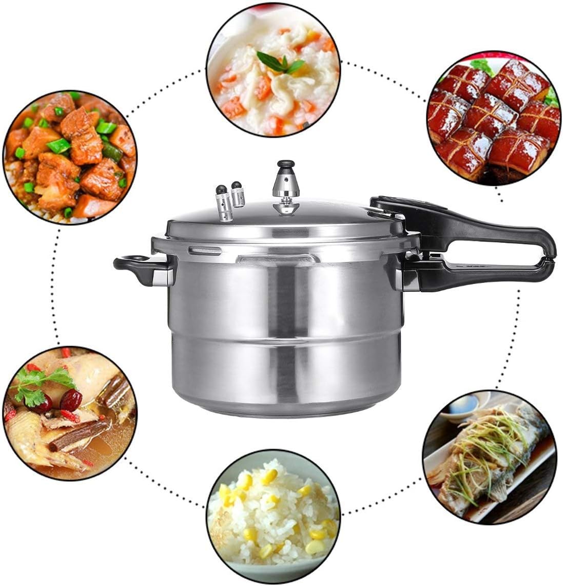 Specification:Type: Pressure CookerCapacity: 7LColor: SilverMaterial: Aluminium AlloyPressure Release: YesApplicable Number: 3-6 Pot Depth: 16cm / 6.30in (approx.)Pot Diameter: 24cm / 9.45in (approx.)Overall Height: 24cm / 9.45in (approx.)Overall Length: 45cm / 17.72in (approx.)Features:● polished, no coating, easy cleaning.● Suitable for induction cooker, electric furnace, ceramic furnace, and gas furnace.● Pressure cooking preserves flavors and nutrients, lean cuts of beef and pork cook up tender and delicious.● The pressure cooker has large capacity for all types of cooking purpose. It is large enough for your daily family use.● seals for safety protection and ensures the high performance of the pressure cooker. It is and you don't have to replace it repeatedly.● Aluminum material is a fantastic thermal conductor which means that heat can easily and quickly spread. This means that you don’t have to wait for minutes for the material to heat up.Warm Tip:● When all the pressure is released and it is safe to the cooker, the lid-lock mechanism allows you to safely the top lid.Package Included:1 x Pressure Cooker (come with a steam plate)Notice:- Please allow slight dimension difference due to manual measurement.- Please consider the actual sizes in the listing as the pictures are generally enlarged to show detail.- There might be a little color difference due to the monitor, camera or other factors, please refer to the physical item.- Due to different producing batches, product details might be a little different. If you minding the difference, please buy it carefully.The silicone handle stays cool to the touch and provides a comfortable grip, while the riveted handle ensures strength and durability.
