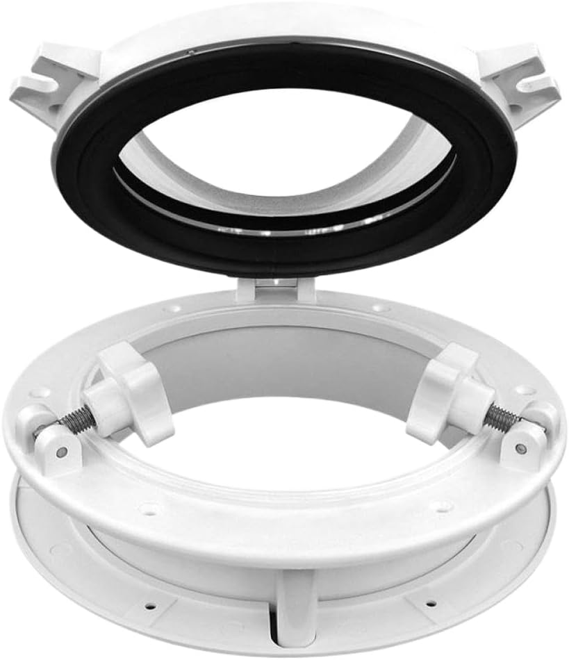 The 8 inch round boat hatch is designed for marine decks on boats, yachts, RVs, and industrial vehicles, providing a functional window solution for marine and transport applications.Built from anti-aging ABS thermoplastic with reinforced construction, this hatch offers function, corrosion resistance, and easy installation.Shape: Round Material: Anti-aging ABS thermoplastic Glass: 4mm thick tempered glass for strength, clarity, and chemical resistance Fittings: Corrosion-free synthetic fittings and rubber seals Mechanism: Swing-open design with adjustable fittings Installation: Easy click-in construction with pre-drilled countersunk holes for screws (screws not included) Diameter with open window: 7 3/4 inches (197 mm) construction ensures long-term function in harsh marine environments.resistant ABS material prevents discoloration and degradation from sun exposure.Click-in design with pre-drilled holes simplifies installation.316 stainless steel accessories and synthetic fittings resist rust.Rubber seals provide water-tight function.Tempered glass resists chemical corrosion, scratches, and impacts.This porthole hatch enhances airflow, natural light, and visibility while maintaining a sleek, professional appearance.