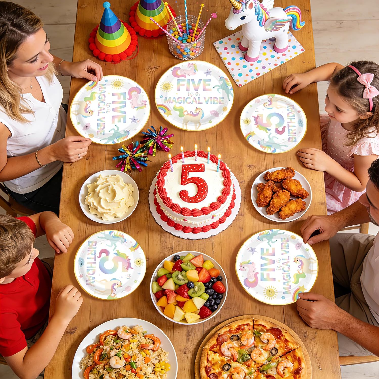 96 Pcs Magical Pastel Unicorn 5th Birthday Party Supplies Five is a Magical Vibe Plates and Napkins Disposable Rainbow Unicorn Tableware Set for Girls 5 Years Old Birthday Party Decorations Serves 24