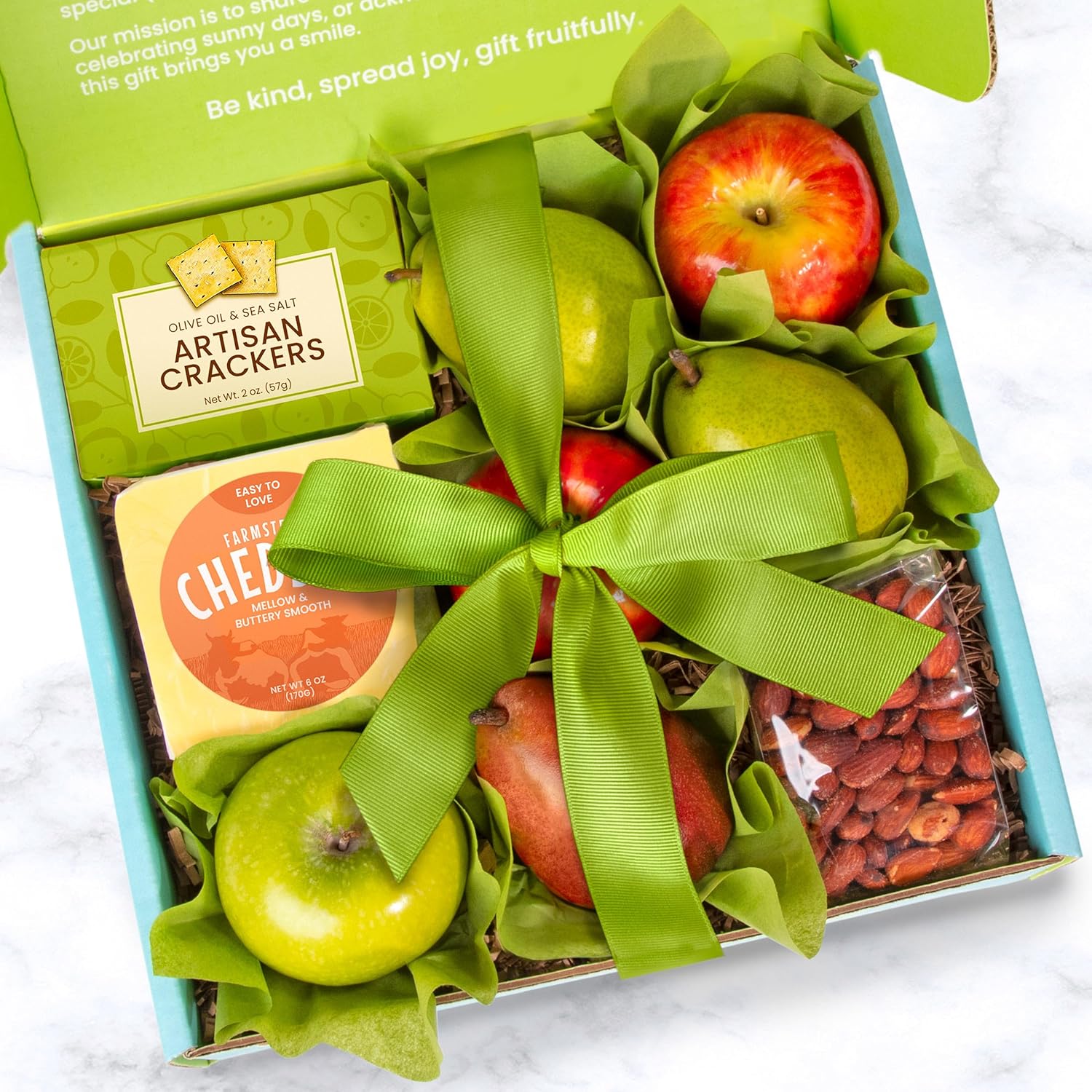Fresh fruit favorites and gourmet treats make a perfect gift for any occasion. This happy box of perfectly balanced pairings include healthful pears and apples, all natural artisanal Green Label Gouda, roasted & salted California almonds, and Olive Oil Sea Salt crackers. All packed in our eco-friendly recyclable box, and tied with a ribbon, ready for gift giving.