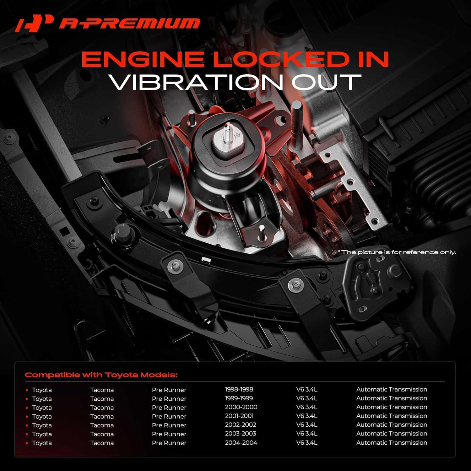 A-premium Transmission Mounts are an ideal choice to replace your broken Transmission Mounts. All Transmission Mounts meet or exceed OEM specifications. Due to high manufacturing standard, it will come with one year quality guarantee. Compatible with Toyota Models: 1998-2004 Tacoma Pre Runner V6 3.4L Specifications: Bracket Material: Steel Mount Material: Steel, Rubber Mounting Bracket Included: Yes Mounting Hardware Included: No Mounting Hole Quantity: 8 Stud Quantity: 0 Type: Solid OEM Number: 1237162130, A7274 Quantity Sold: One Piece Note: It only fits model with Automatic Transmission