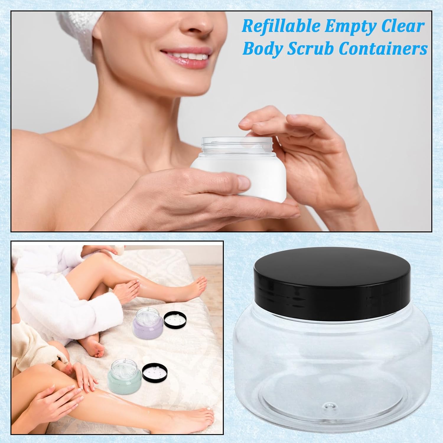 Acrux7 24 Pack 8 oz Plastic Containers with Lids, Clear Body Scrub Jars, 250ml Wide Mouth Refillable Cosmetic Jars, Empty Sugar Scrub Containers, 4 Sheets of Labels Included Features 1.Keep your homemade scrubs and creams fresh with a secure seal from the black leak-proof lid and built-in PE gasket 2.See your creations at a glance through the clear material, and easily fill or scoop thanks to the wide opening 3.This practical set provides 24 versatile body scrub jars with lids, plus 4 sheets blank labels for simple organization Specifications Material: Clear PET plastic Color: Transparent jar with black lid Size: 2.5 inch (6.3 cm) tall, 3.54 inch (9 cm) in diameter (low-profile shape) Capacity: 8 oz / 250 ml Quantity: 24pcs jars with lids, 4 sheet of labels included Shape: Wide-mouth, rounded jar Important Notes 1.Clean jars by hand with mild soap and water, then dry completely before first use 2.Ensure the lid is firmly tightened to take advantage of the leak-resistant seal 3.Store in a place away from prolonged direct sunlight to help maintain clarity 4.The plastic is strong for everyday use, but please handle with care to avoid scratches 5.Labels are included for your convenience to mark and identify your creations