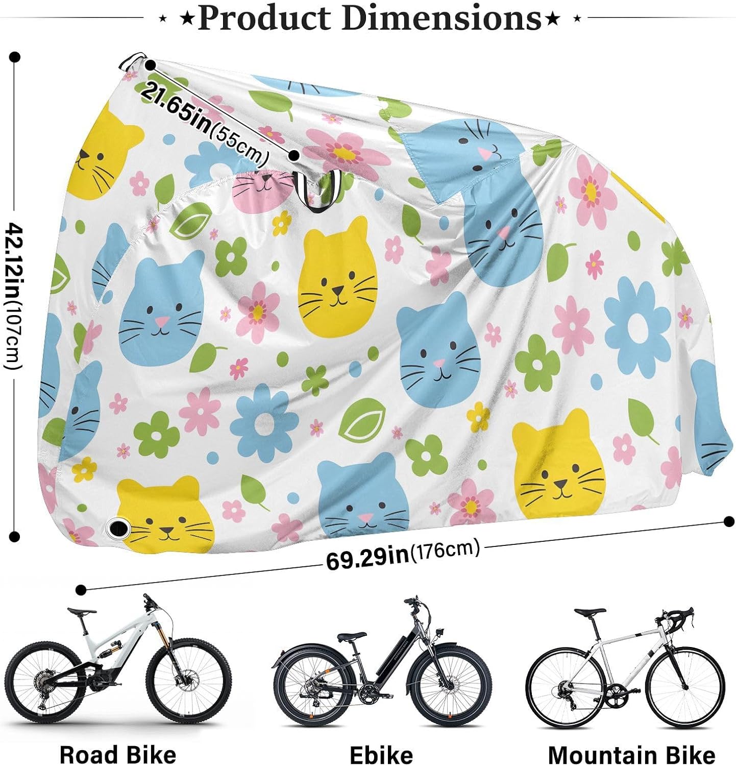 Protect your bicycle in style with our premium bike tarp, engineered for maximum defense against harsh elements. Unlike basic covers, we use specially engineered umbrella waterproof fabric - the same advanced material used in high-end rain umbrellas - delivering superior performance with unique visual appeal. Sun & Heat Defense Our fabric creates a physical cooling barrier that actively lowers your bike's temperature by: Blocking 95%+ harmful UV rays to prevent paint fading Providing exceptional shading & heat insulation (up to 20℉/11℃ reduction vs direct sun) Offering SPF 50+ equivalent protection for sensitive components Rain & Dust Protection Water-repellent coating causes rain to bead and roll off Tightly woven fabric acts as dustproof barrier for long-term storage Prevents moisture buildup with breathable side panels (prevents condensation) User-Focused Design LOCK ACCESS HOLE at front wheel enables secure locking without removing cover ADJUSTABLE BUCKLE STRAP at rear wheel anchors cover during strong winds Reflective safety strips on handles enhance nighttime visibility Ultra-lightweight (23 oz) folds into included pouch Unbeatable Aesthetics Choose from over 1,000 designer patterns - from sleek geometrics to vibrant nature motifs - transforming your bike into a street-style statement while competitors offer only solid colors.