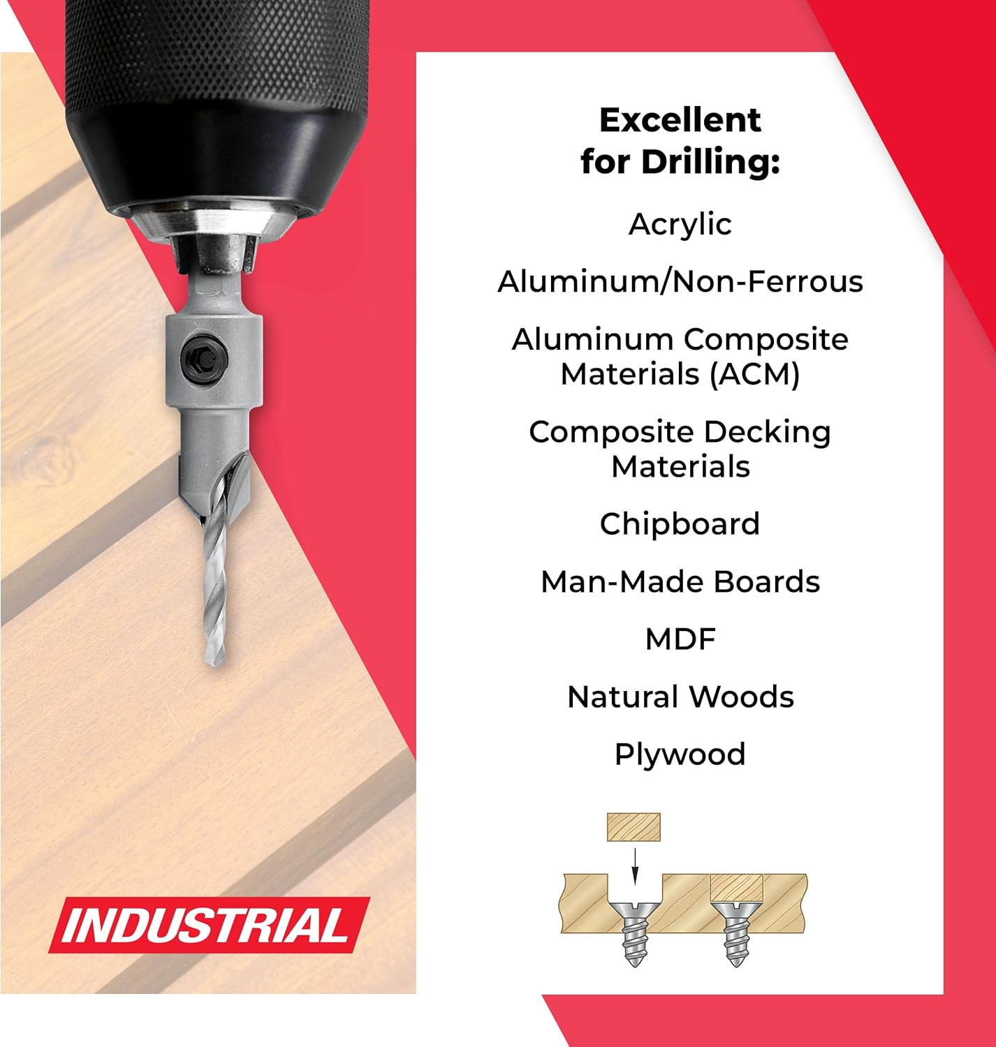 Experience precision and efficiency with the Amana Tool Countersink Bit including a slow spiral, High-Speed-Steel (HSS) M2 fully ground drill bit. This countersink drill bit for wood, composite, and aluminum is designed for long-lasting performance. The Amana countersink drill bit is designed to minimize chatter, reduce heat, and produce clean, precise holes in a variety of materials. Fully ground to DIN 338 standards, it provides consistency for woodworking, cabinetry, furniture assembly, and general construction. Available in multiple sizes, the Carbide Tipped 82 Degree Countersink delivers dependable performance for professionals who demand precision and reliability. Please note: When drilling aluminum-ferrous materials, for optimal performance and extended tool life use lubricant or air cooling. Make sure the material is fixed and the drill is stable during drilling.