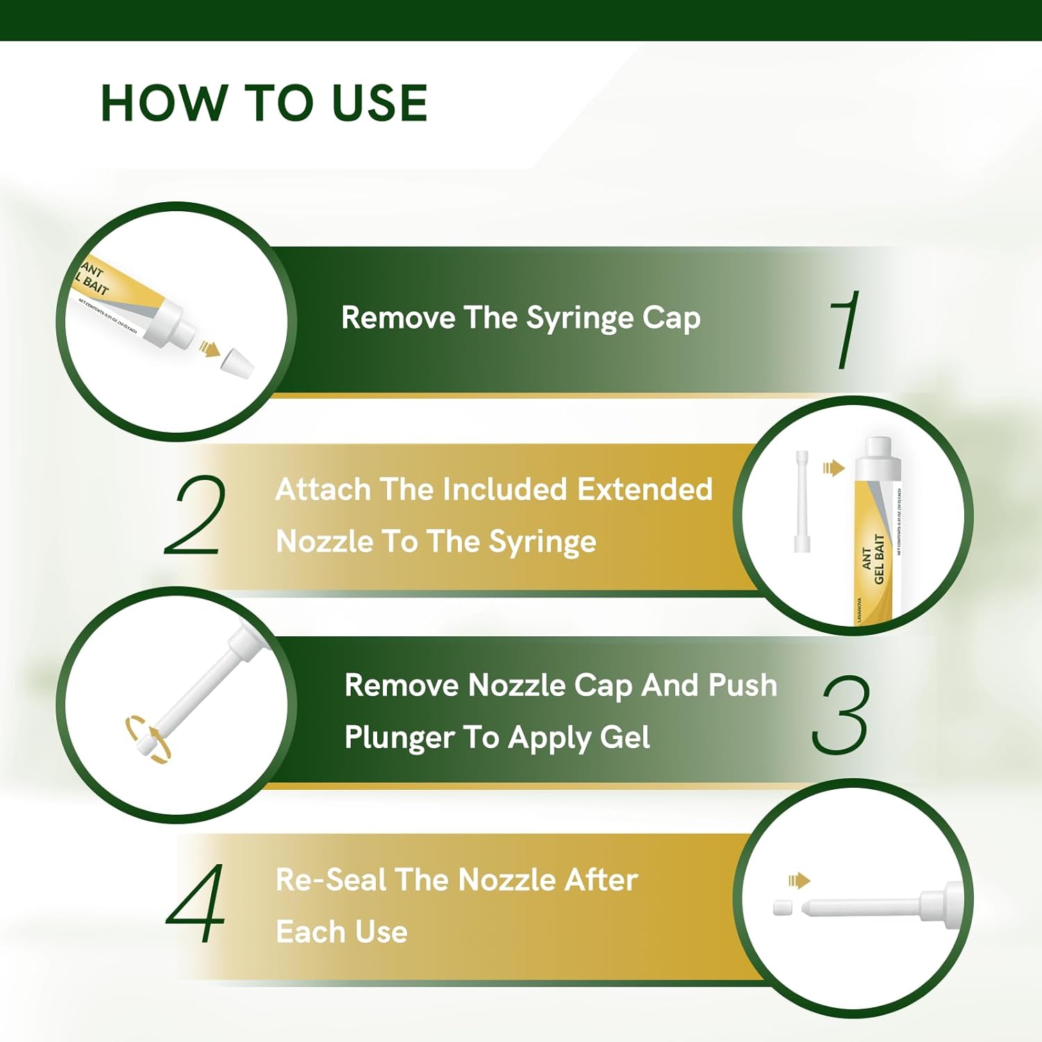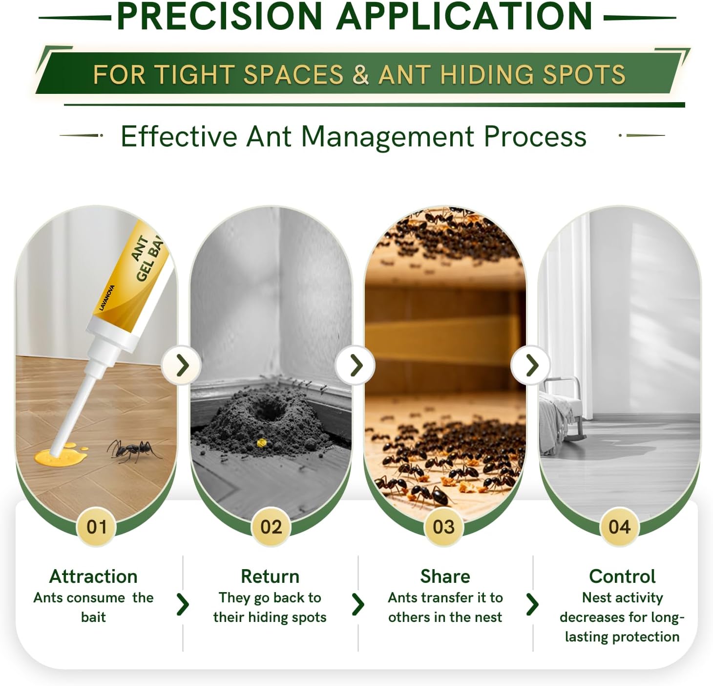 Ant Gel Bait is a ready-to-use ant killer gel for indoor and outdoor use. Designed for control of most major ant species, this ant bait gel helps target common household ants in kitchens, bathrooms, garages, patios, basements, and other problem areas around the home. The syringe-style design allows easy application in cracks and crevices, along baseboards, near entry points, inside cabinets, and under sinks where ants travel and gather. Ants consume the bait and carry it back to hidden nest and colony areas, helping target both visible ant activity and hidden colony activity. With 4 tubes x 10g, this ready-to-use ant gel bait provides convenient multi-area placement for practical home ant control.
