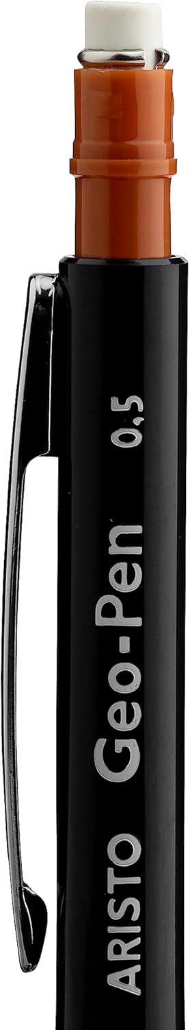 Mechanical Pencil Geo-Pen Design: Replaceable refill, push-button mechanism. Barrel Material: Plastic Grip design: ergonomically grooved grip. ISO label available. Eraser present. Eraser replaceable. Clip present. Ensures the most precise drawing, as the lead routing is guided exactly at the edge of the ruler or stencil, rounded metal pushbutton. Barrel colour: black. Lead Thickness: 0.5 Hardness name: HB.