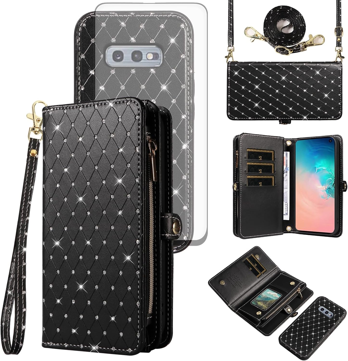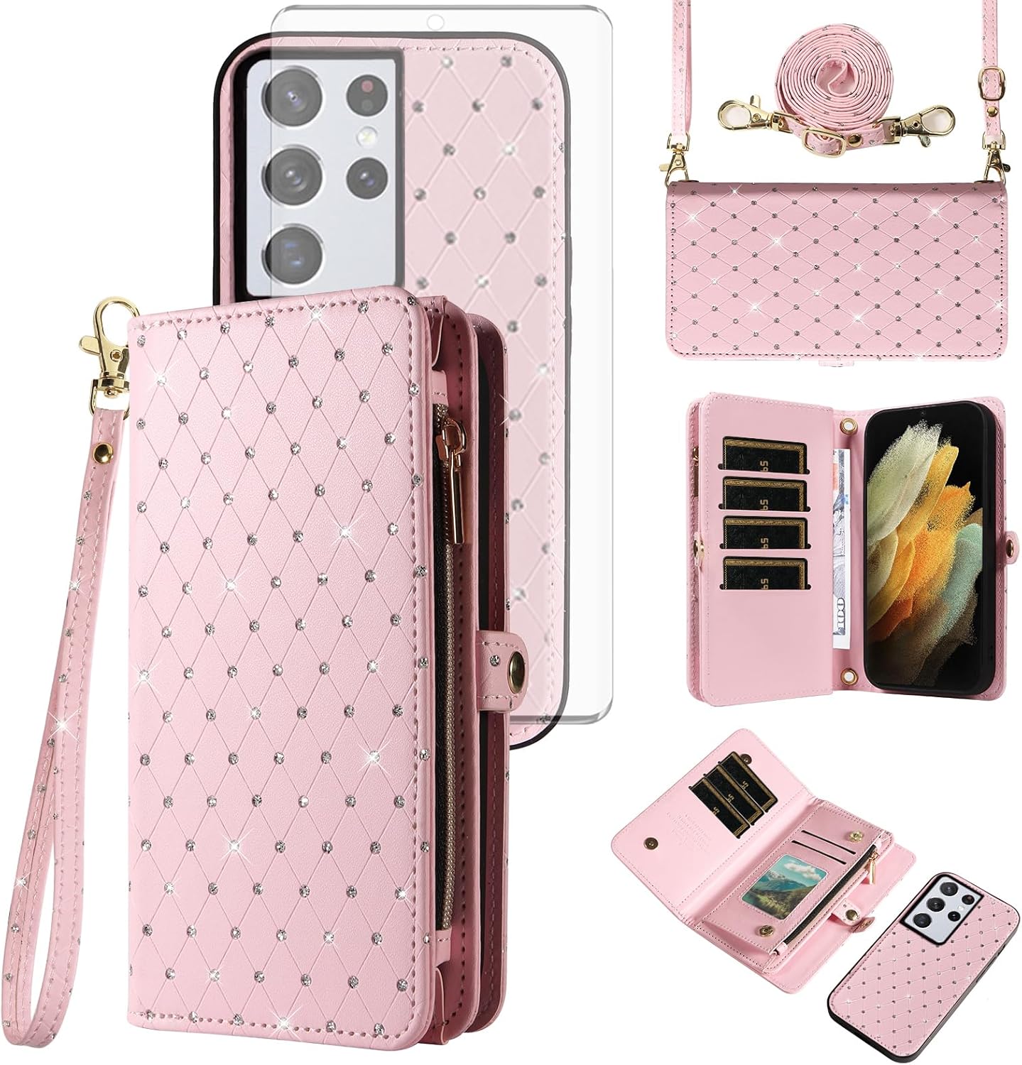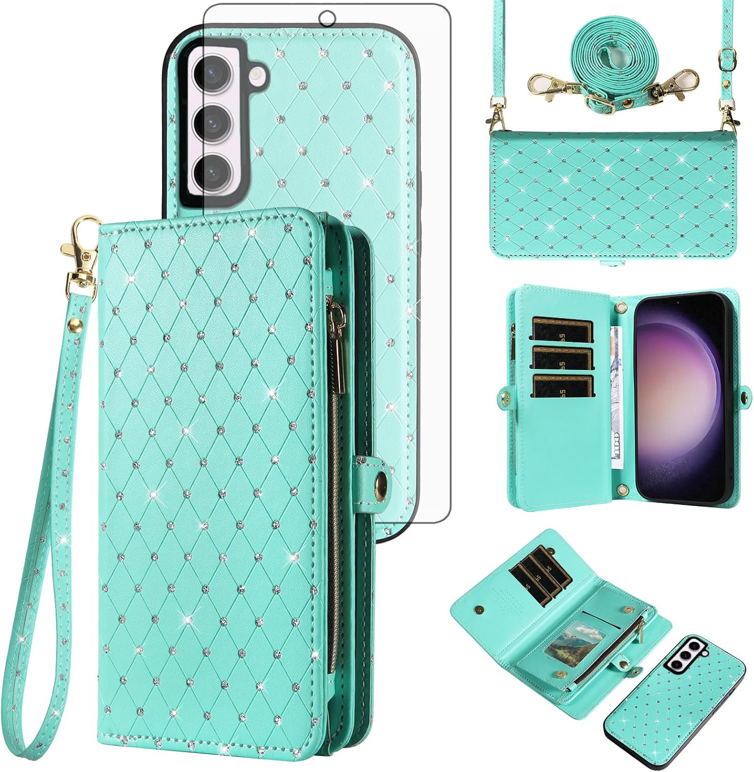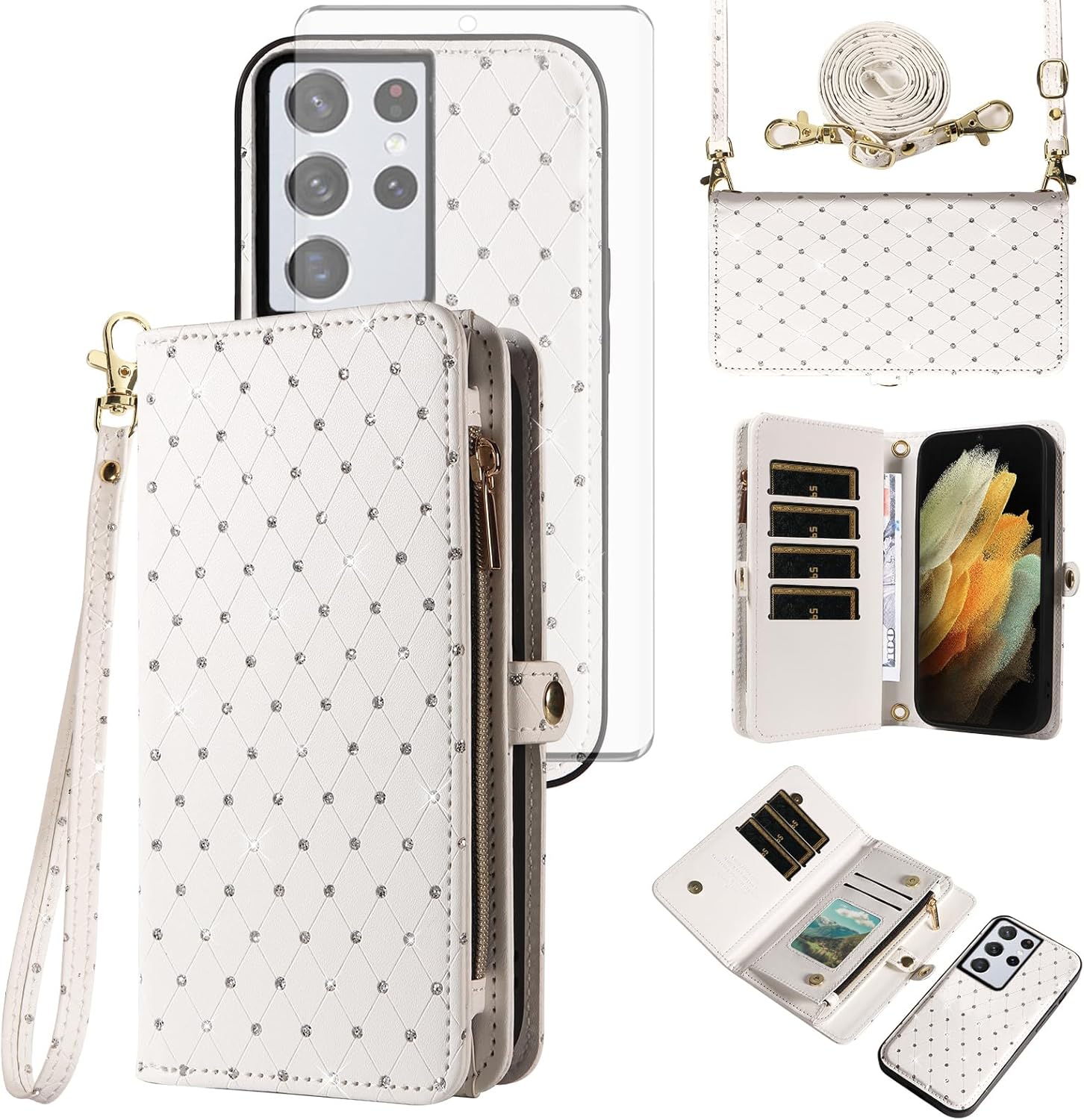 【Compatible Models】: Compatible with Samsung Galaxy S22 5G (6.1 inch), NOT compatible with other devices.【Package includes】: We will send the phone case with 1 piece tempered glass screen protector + 1 detachable wrist strap + 1 detachable crossbody strap. It would be a nice gift for your lover, your family and your friends.【Support Detachable & Magnetic Car Mount】: You could use the removable back cover as a simple protective back cover alone, the back cover with built-in metal disk can be attached to a magnetic car phone holder, but please notice that it don't work with wireless charging.