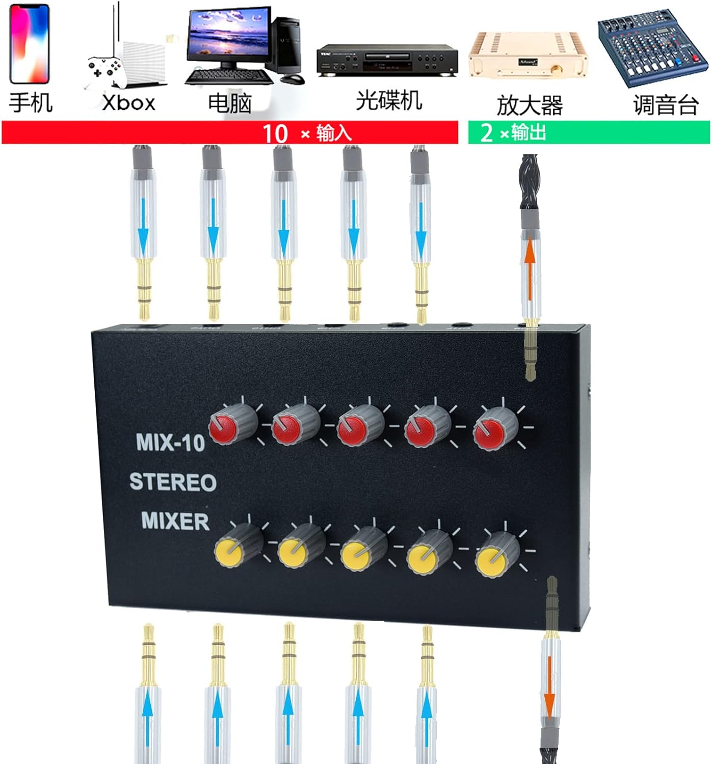 Stereo 10 channel audio input is mixed into 2 channel stereo output, which can directly drive headphones or connect power amplifiers, 3.5mm headphone socket, and potentiometer separately controls the volume of each channel without affecting each other. 10 high-quality 09 duplex potentiometer, static current of about 15 ma, low-noise 4580 dual operational amplifiers, maximum power supply of up to 24V, and amplification factor of about 2 times. Please use a low-ripple high-quality DC power supply for power supply, and use shielded wires for audio connection, which is beneficial for signal purity. The working voltage of the 10 circuit board is between 5-12v, with a static current of approximately 270ma for 5v power supply and 103ma for 12v power supply