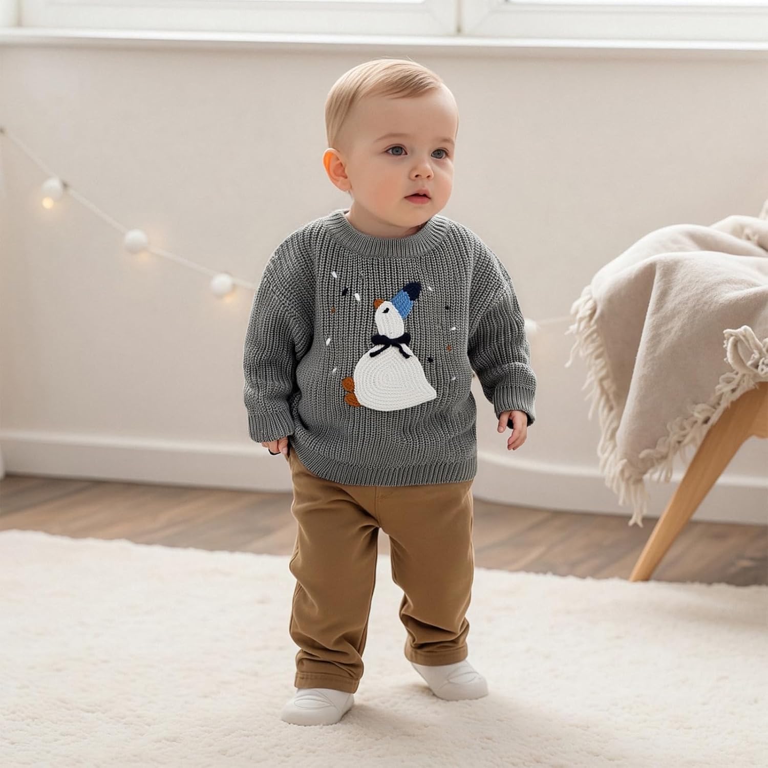 Scloutarry Baby Birthday Sweater Toddler Boy Girls Goose Clothes Long Sleeve Silly Goose Embroidery Sweatshirt Knit TopsFeatures:-- This sweater is cute which will be a great surprise for toddlers as a Christmas present.-- Hand/Machine wash cold and hang dry, and will not shrink, even with repeated washings.-- When you choose size, please have a look at SIZE CHART below.Size(cm)80 Length: 64 Bust: 64 Sleeve: 23 Shoulder: 30 Advised Age: 9-12 Months90 Length: 66 Bust: 66 Sleeve: 24.5 Shoulder: 31 Advised Age: 12-18 Months100 Length: 68 Bust: 68 Sleeve: 26 Shoulder: 32 Advised Age: 18-24 Months110 Length: 70 Bust: 70 Sleeve: 28 Shoulder: 33 Advised Age: 2-3 Years120 Length: 72 Bust: 72 Sleeve: 30 Shoulder: 34 Advised Age: 3-4 YearsSize(inch)80 Length: 25.20 Bust: 25.20 Sleeve: 9.06 Shoulder: 11.81 Advised Age: 9-12 Months90 Length: 25.98 Bust: 25.98 Sleeve: 9.65 Shoulder: 12.20 Advised Age: 12-18 Months100 Length: 26.77 Bust: 26.77 Sleeve: 10.24 Shoulder: 12.60 Advised Age: 18-24 Months110 Length: 27.56 Bust: 27.56 Sleeve: 11.02 Shoulder: 12.99 Advised Age: 2-3 Years120 Length: 28.35 Bust: 28.35 Sleeve: 11.81 Shoulder: 13.39 Advised Age: 3-4 YearsSpecification:Material: 95%Cotton, 5%PolyesterColor: Multi-colorGender: Boys, GirlsStyle: CasualSeason: Spring, Fall, WinterPackage Included1 X Sweater