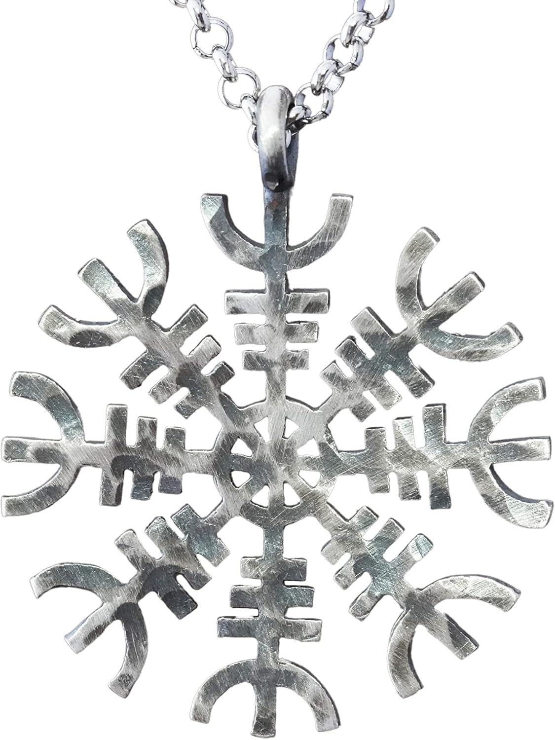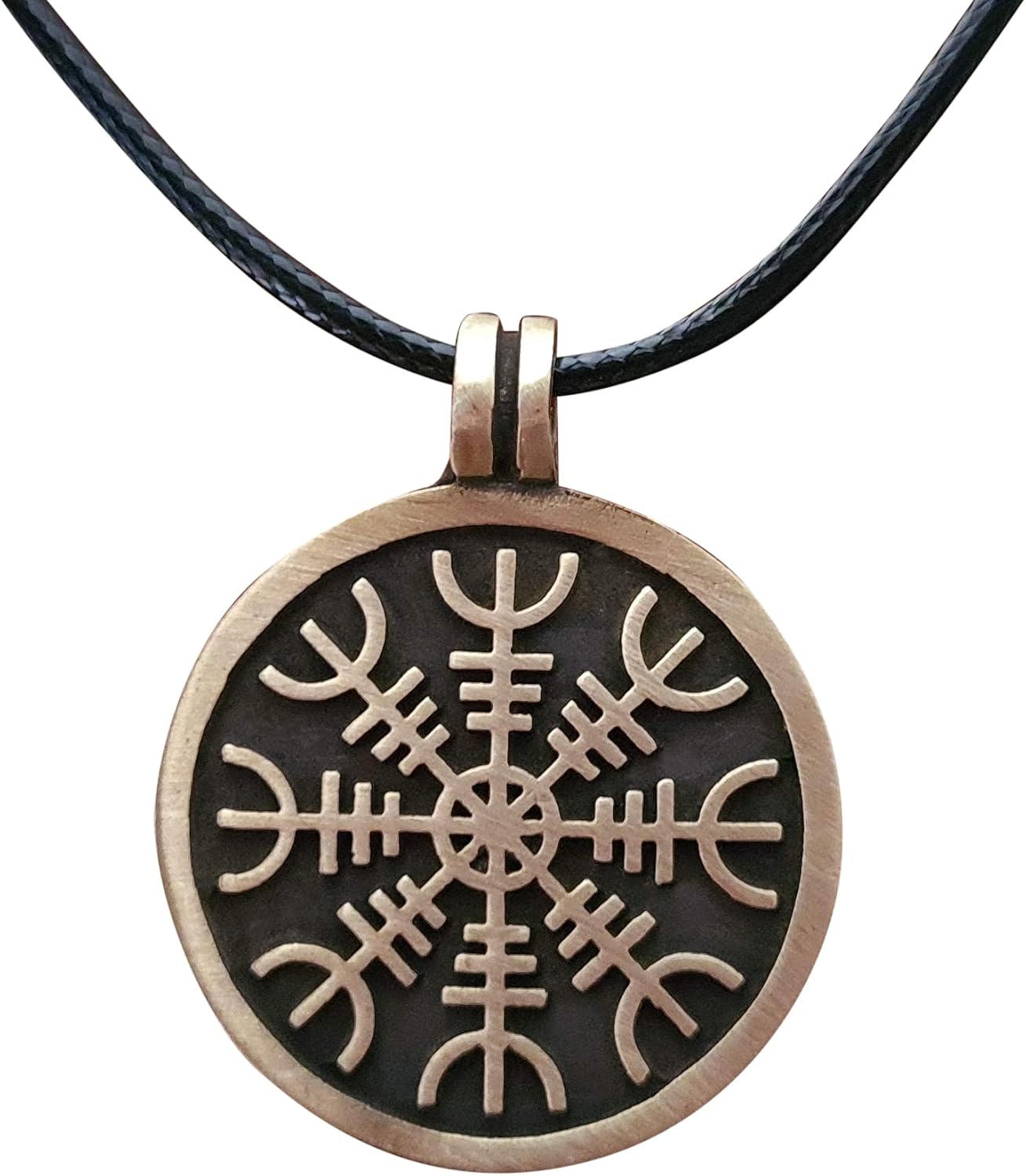 Aegishjalmur is an ancient protective talisman of the Norse ---but the true nature of its magic has many interpretations. In icelandic sagas it can be found to confer power and dominance in conflict. Aegishalmur instill fear in one's enemies and to conquer fear in one's own mind. Aegishjalmur contains two numerical patterns, 3 and 8, that were sacred to the Northern tradition. And multiples like 24, the number of runes in the elder futhark, or runic alphabet. But its most prominent feature is the rune Elhaz. Elhaz can be used by itself for protection of a person, place or thing. It can create a sacred space or scatter negative energy, people or groups. Elhaz protects, links us to guardianship, a sovereign right to exist, for our time here. The rune is shaped like someone with outstretched hands to the heavens. In the Aegishjalmur, Elhaz is also contained 8 times not only at the ends of each spoke, but 8 times hidden in the spokes themselves. Comes with bronze color metal chain.