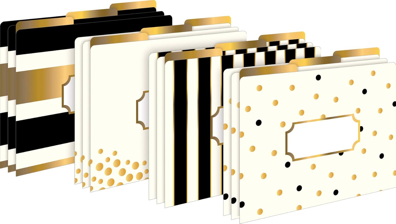 Barker Creek's Gold Folder/Pocket Set will help you stay on task in style! Each package includes 12 letter-size file folders and 30 peel & stick library pockets. The folders are 1/3 tabbed, reversible, and come with four each of three designs. The pockets easily fit a standard index card, feature a preprinted 'label", and come with 10 each of 3 designs. Look for more coordinating Gold products also by Barker Creek.