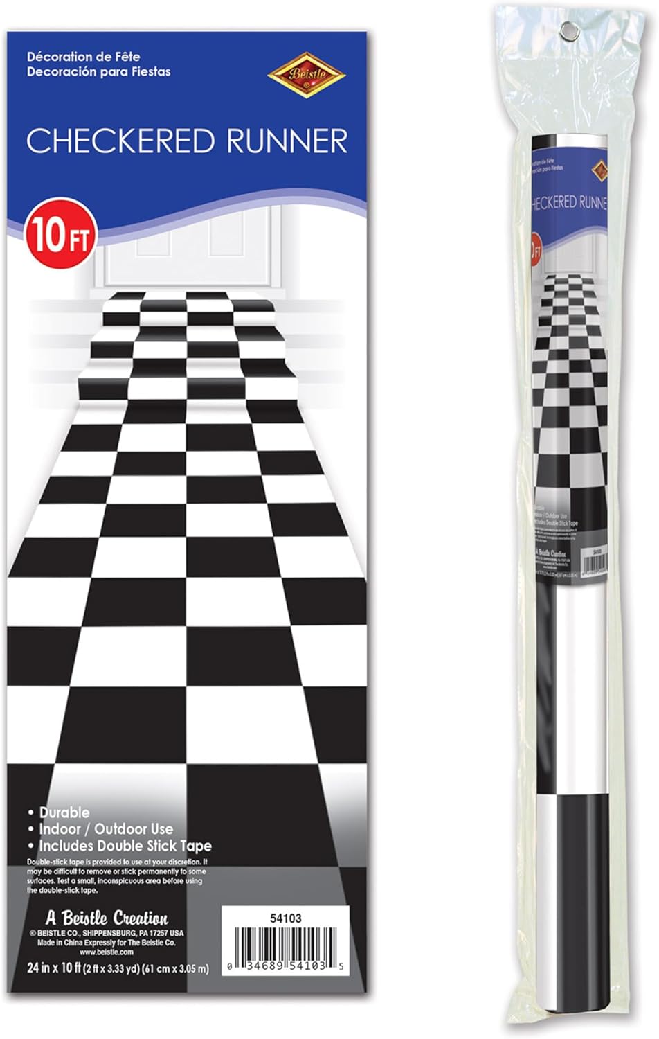 Beistle Checkered Runner. The black and white checkered runner is perfect for a racing themed party It is made of a poly material with double-stick tape. The runner measures 24 Inch wide by 10 feet long.