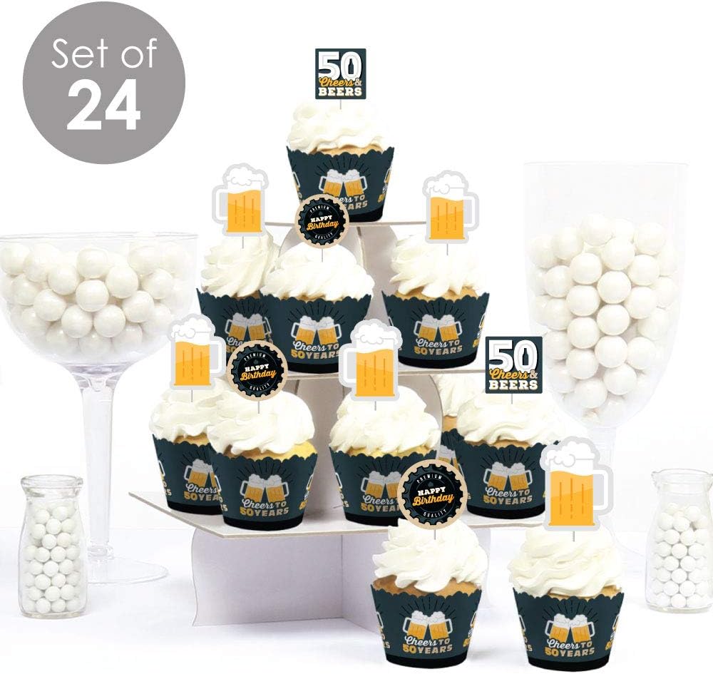 Style the perfect dessert buffet with Cheers and Beers to 50 Years Cupcake Wrappers and Treat Picks Kit. This do-it-yourself kit includes 24 clear treat picks, 24 assorted shaped cut-outs, and 24 cupcake wrappers. Simply attach each double-sided paper cut-out to a clear plastic pick with the included adhesive dots. Then, easily adjust the width of the wrapper to perfectly fit your cupcakes and insert the finished pick into the top of cupcake. Treat Pick Toppers look great on standard cupcakes or add them to other goodies such as brownies or appetizers. Cupcake Treat Pick Toppers and Wrappers will bring your Cheers and Beers to 50 Years theme to life.