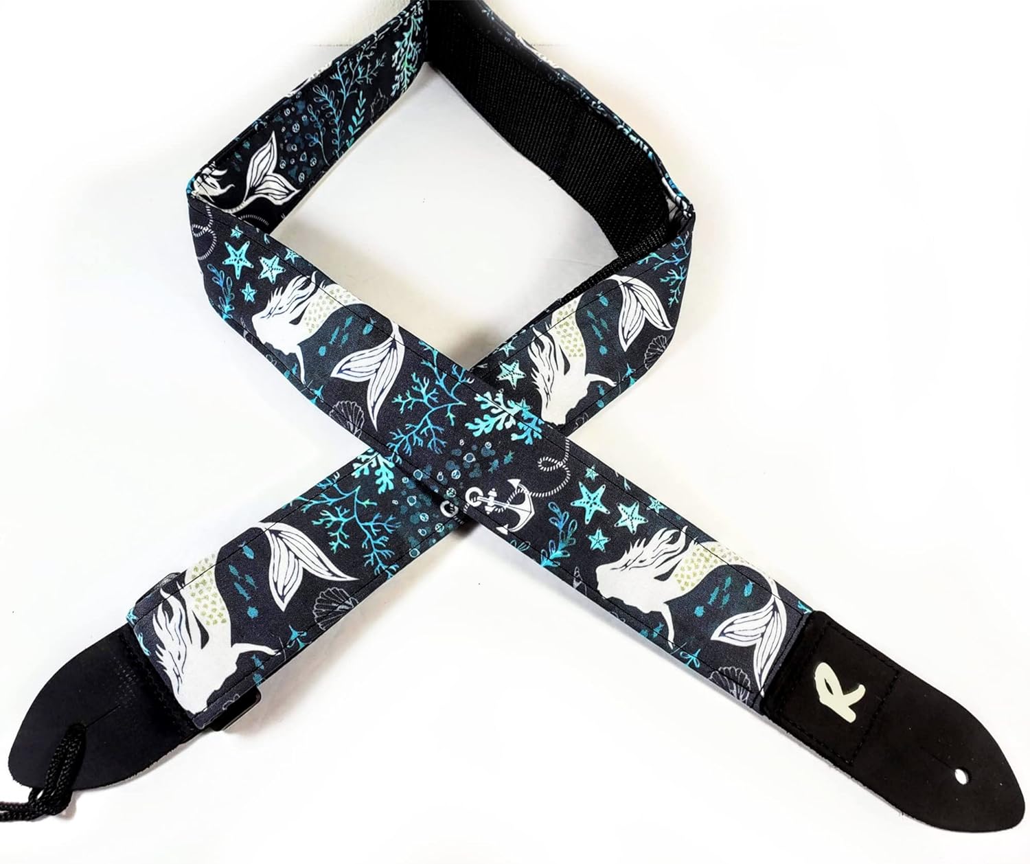 The Blue Mermaid Guitar Strap features a beautiful ocean design to make a completely unique guitar strap. Perfect to use for yourself or to give as an amazing accessory gift for an acoustic, electric or bass guitarist. At the core of the strap is strong nylon webbing and cotton padding; it is surrounded by durable fabric. That way you can be assured that your guitar strap will be comfortable and reliable. We proudly create straps that work for acoustic, electric and bass guitars. Our guitar straps are rated to hold over 200 lbs. with no stretching. We search everywhere for the best materials and styles to provide you with an amazing guitar strap.