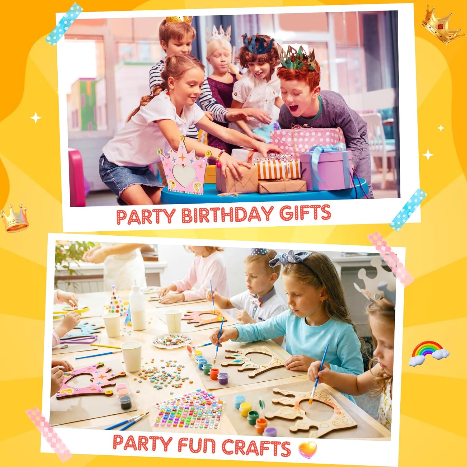 | Included Components | 12 wooden crown photo frames, 1 set of 12-color acrylic paints, 4 diamond stickers (styles: plum blossom style, heart style, round style, square style), 12 color paint, 1 paint brush (not explicitly stated but implied for painting the frames) |
