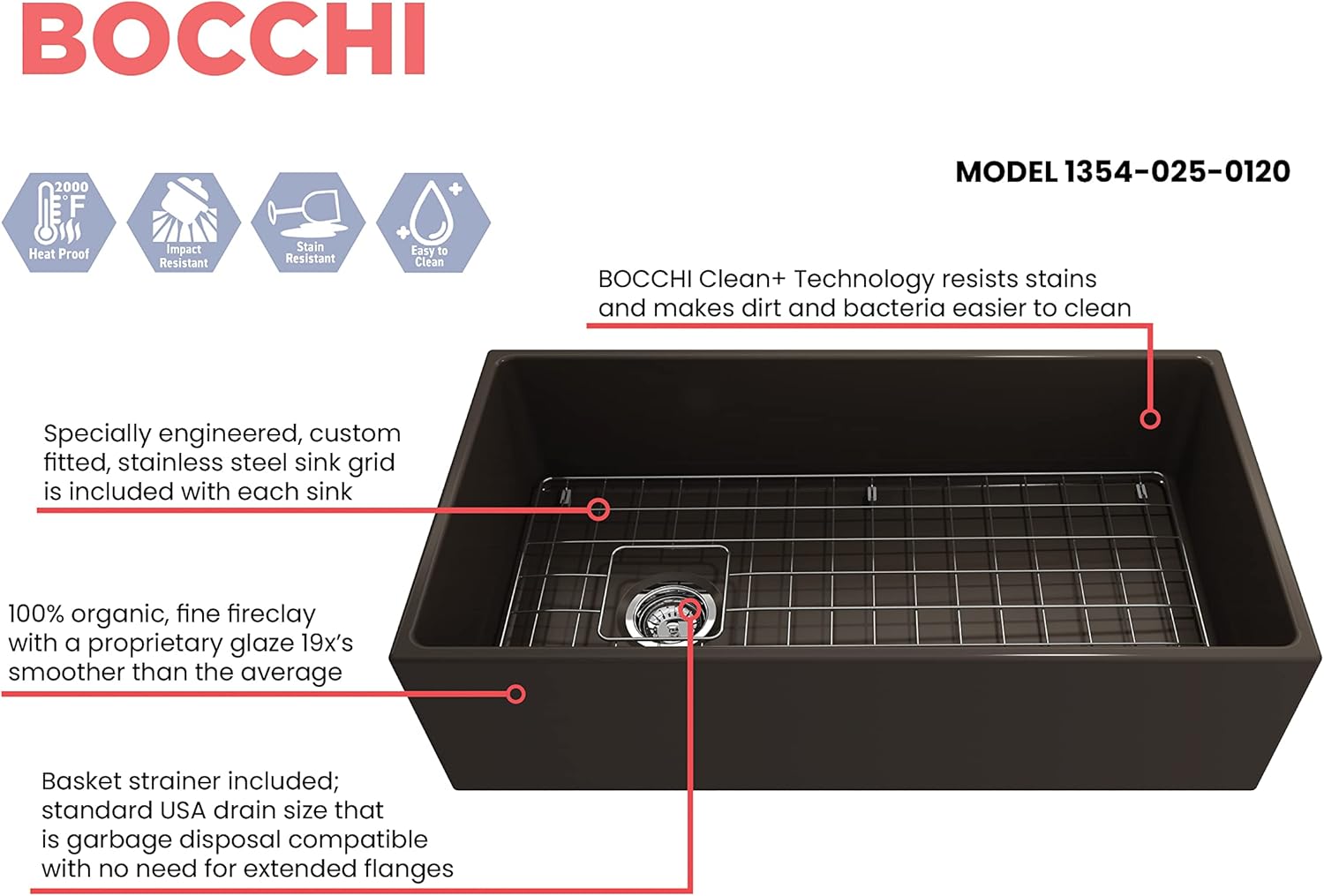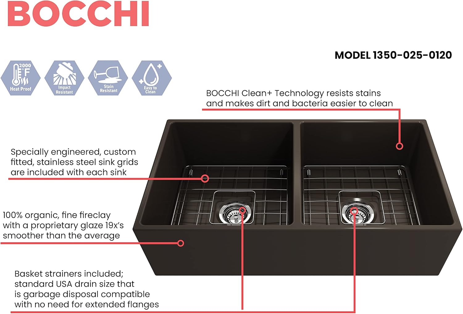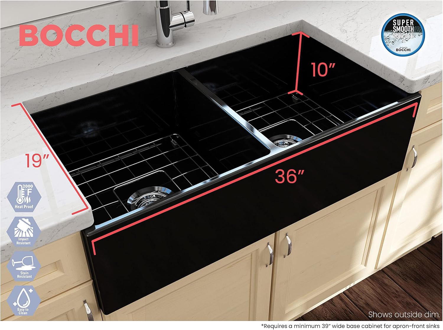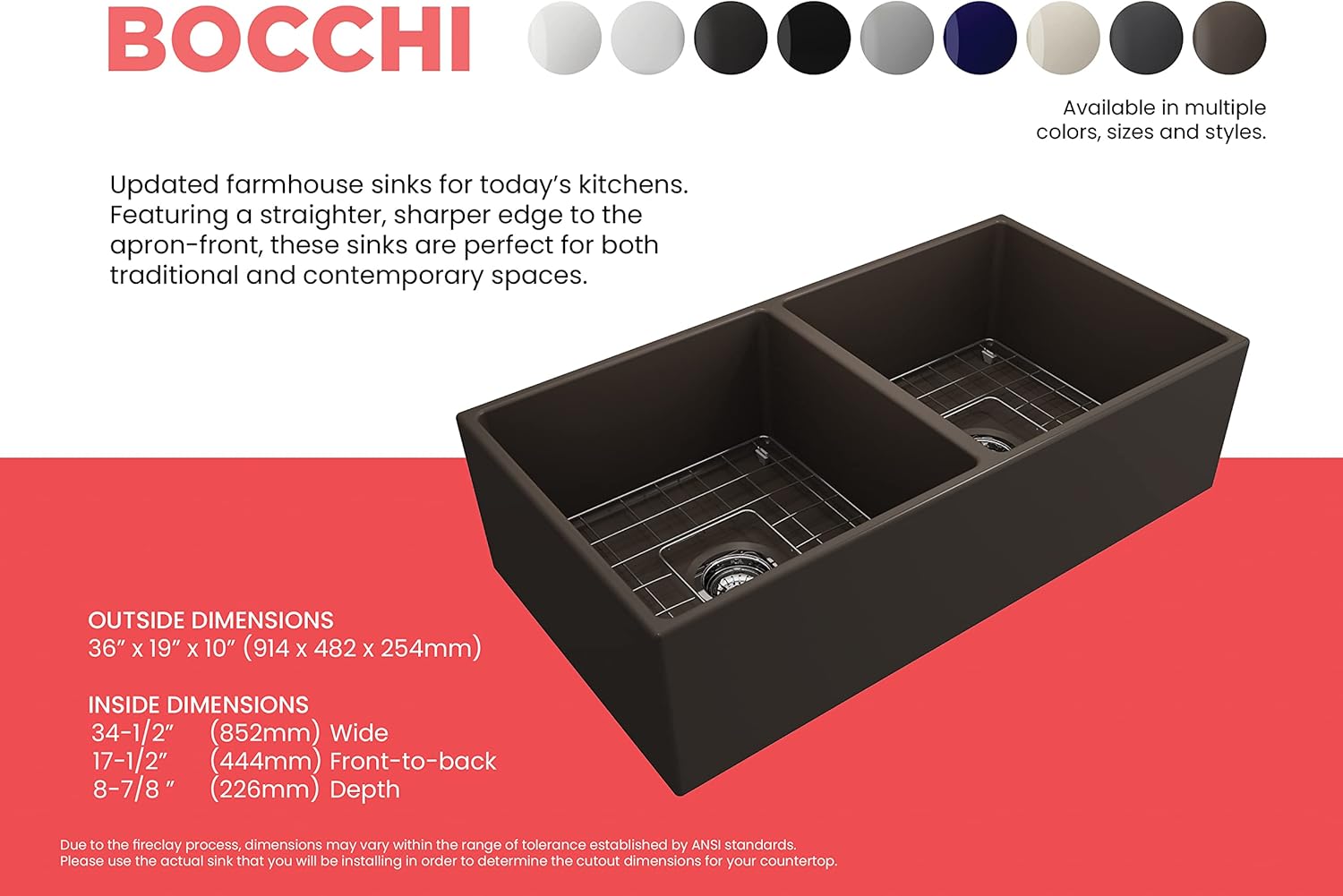 Product Description BOCCHI sinks bring back the ultimate material to your kitchen. FIRECLAY, a 100% NATURAL ORGANIC and recyclable material used by Craftsman for centuries to create timeless appliances has now returned to your kitchen. With the firing in our Kilns up to 2000°f temperatures, FIRECLAY becomes the most DURABLE MATERIAL used in today's kitchens. Dealing with extreme heat coming from pots and pans - no problem. Due to their special glaze coating fused with the FIRECLAY body, these sinks have a non-porous, uniform, SCRATCH AND STAIN RESISTENT surface. With its INCLUDED protective bottom GRID and distinctive looks, BOCCHI sinks are truly crafted to match your design and functional desires and beyond. From the Manufacturer BOCCHI Farmhouse sinks bring back the ultimate material to your kitchen. Fireclay, a 100% natural organic and recyclable material used by Craftsman for centuries to create timeless appliances has now returned to your kitchen. With the firing in our Kilns up to 2000°f temperatures, fireclay becomes the most durable material used in today's kitchens. Thus, dealing with extreme heat coming from pots and pans is definitely not a problem. Due to their special glaze coating fused with the fireclay body, our sinks have a non-porous, uniform, scratch and stain resistant surface. With its protective bottom grid and distinctive looks, BOCCHI Farmhouse sinks are truly crafted to match your design and functional desires. P.when('A').execute(function(A) { A.on('a:expander:toggle_description:toggle:collapse', function(data) { window.scroll(0, data.expander.$expander[0].offsetTop-100); }); }); Set Contains: double-bowl-sinks See more
