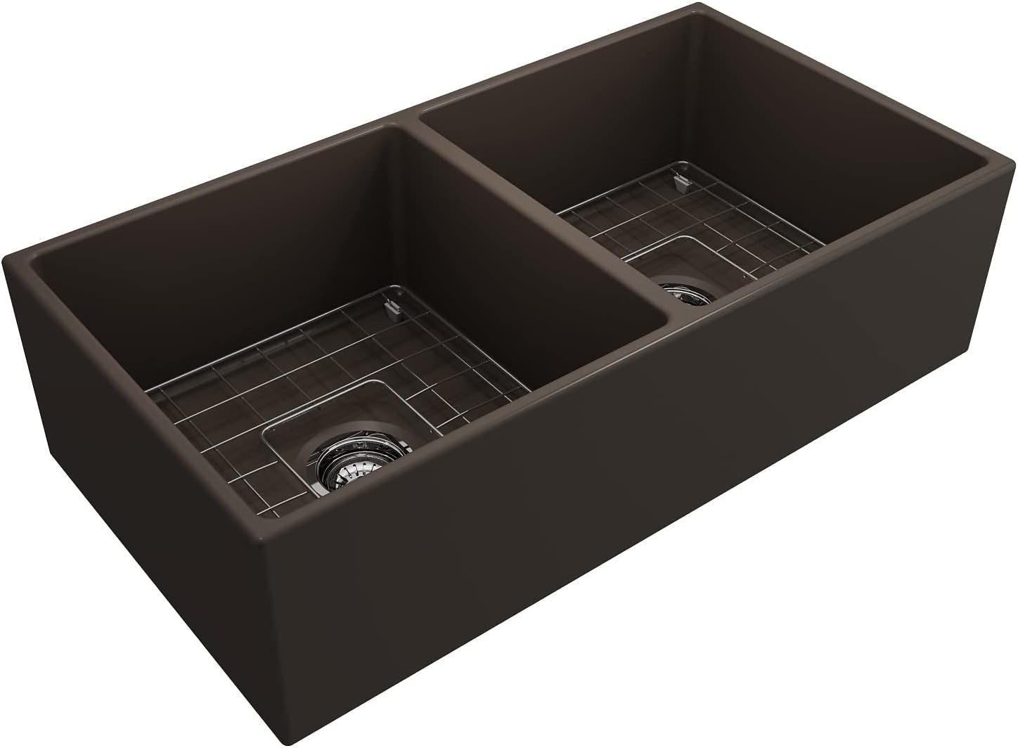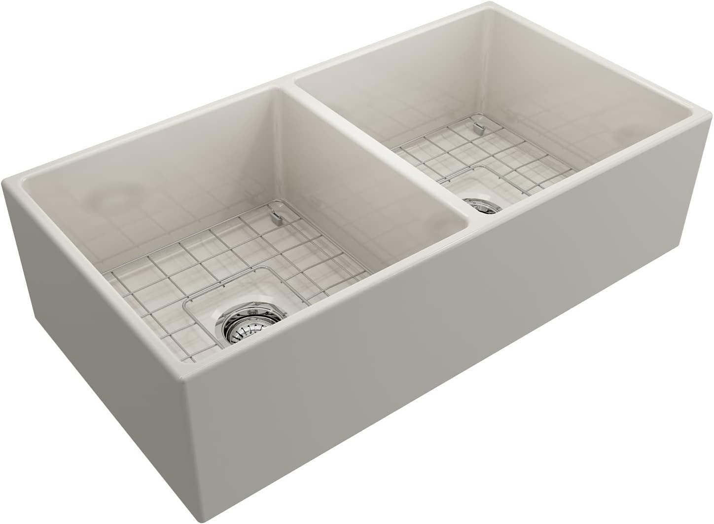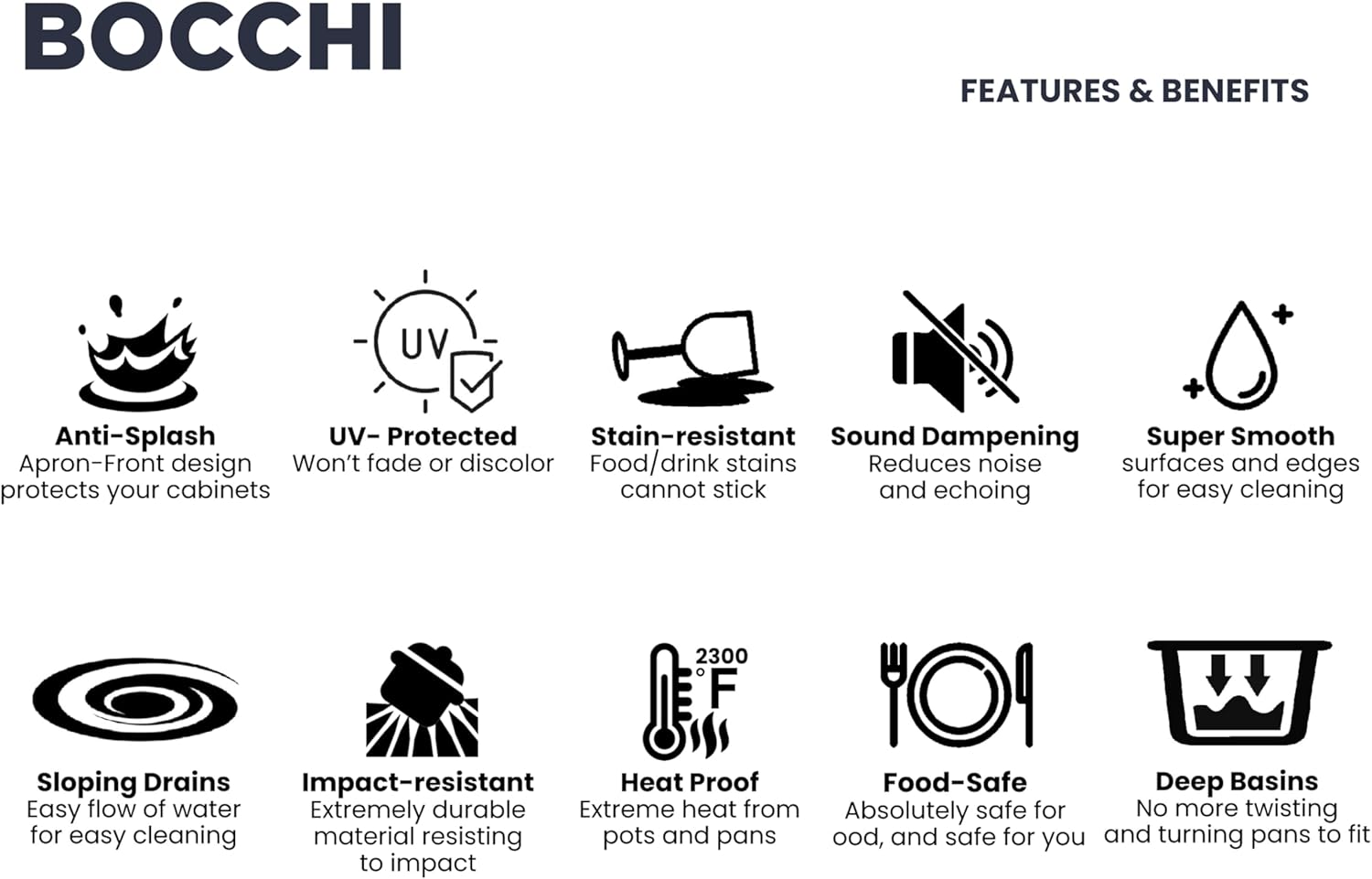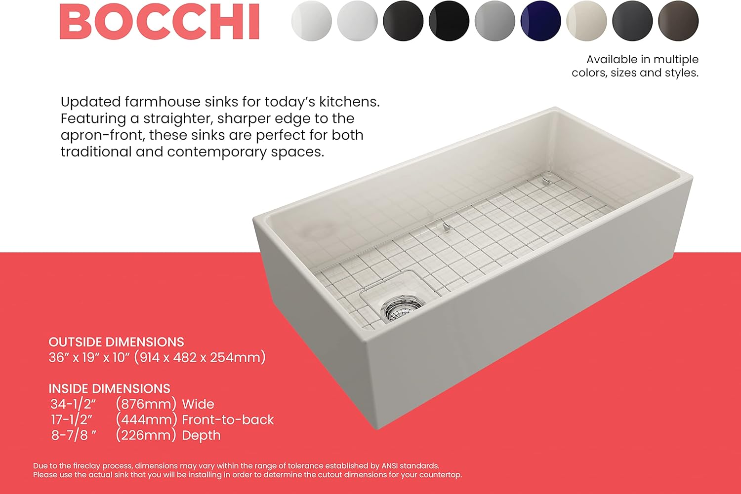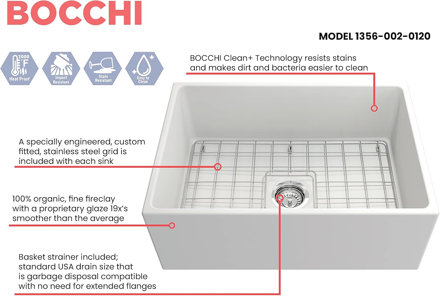 Product Description BOCCHI sinks bring back the ultimate material to your kitchen. FIRECLAY, a 100% NATURAL ORGANIC and recyclable material used by Craftsman for centuries to create timeless appliances has now returned to your kitchen. With the firing in our Kilns up to 2000°f temperatures, FIRECLAY becomes the most DURABLE MATERIAL used in today's kitchens. Dealing with extreme heat coming from pots and pans - no problem. Due to their special glaze coating fused with the FIRECLAY body, these sinks have a non-porous, uniform, SCRATCH AND STAIN RESISTENT surface. With its INCLUDED protective bottom GRID and distinctive looks, BOCCHI sinks are truly crafted to match your design and functional desires and beyond. From the Manufacturer BOCCHI Farmhouse sinks bring back the ultimate material to your kitchen. Fireclay, a 100% natural organic and recyclable material used by Craftsman for centuries to create timeless appliances has now returned to your kitchen. With the firing in our Kilns up to 2000°f temperatures, fireclay becomes the most durable material used in today's kitchens. Thus, dealing with extreme heat coming from pots and pans is definitely not a problem. Due to their special glaze coating fused with the fireclay body, our sinks have a non-porous, uniform, scratch and stain resistant surface. With its protective bottom grid and distinctive looks, BOCCHI Farmhouse sinks are truly crafted to match your design and functional desires. P.when('A').execute(function(A) { A.on('a:expander:toggle_description:toggle:collapse', function(data) { window.scroll(0, data.expander.$expander[0].offsetTop-100); }); }); Set Contains: double-bowl-sinks See more