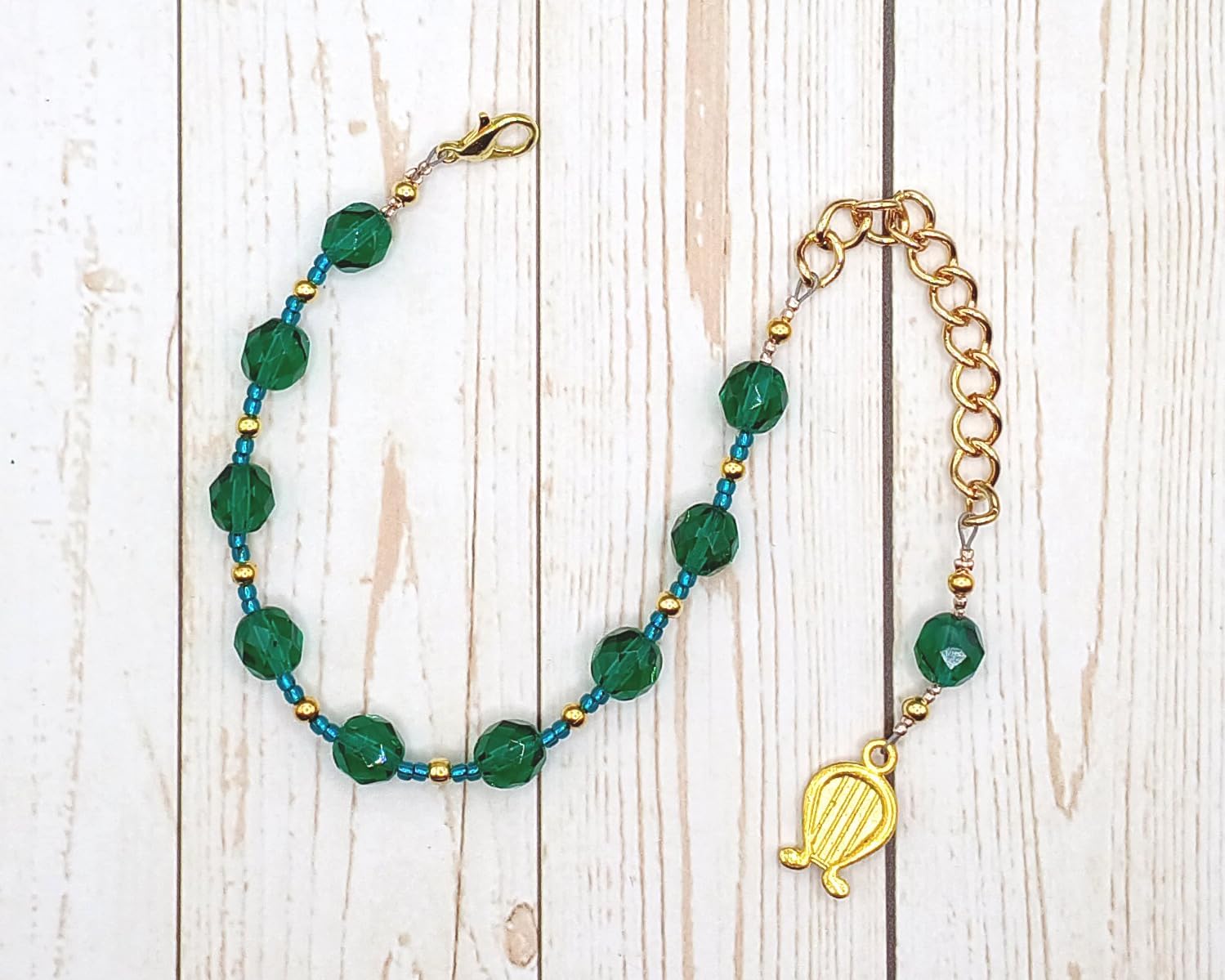 This Bragi prayer bead bracelet consists of nine beads, recalling the nine worlds connected by Yggdrasil,the World Tree. At the end of the string is a pendant, a symbol representing the god: a harp, appropriate for the god of bards. This piece is a smaller, lighter, more easily wearable adaptation of my pocket prayer beads and comes with an adaptation of the same prayer. The bracelet is made from 8mm green Czech fire-polished glass beads separated by gold-toned metal spacer beads and glass seed beads to provide a comfortable transition from one bead to the next and to make the piece lightweight, supple and easy to handle. It is approximately 7 inches (17.8cm) long with a 2-inch (5cm) chain to adjust for size and fit; it adjusts from 7-9 inches (17.8-22.9cm) in length and fits most 7-9" wrists (but can be made for other wrist sizes as well--please contact me for more information on customization!). It is designed to be worn and used in prayer or meditation, but may also be used to decorate an altar or shrine, or to adorn a statue. The beads come with a prayer to Bragi and with a cotton muslin bag for storage. You can, of course, use the beads with any prayers, or for any god or gods, that you choose or that resonate with you.