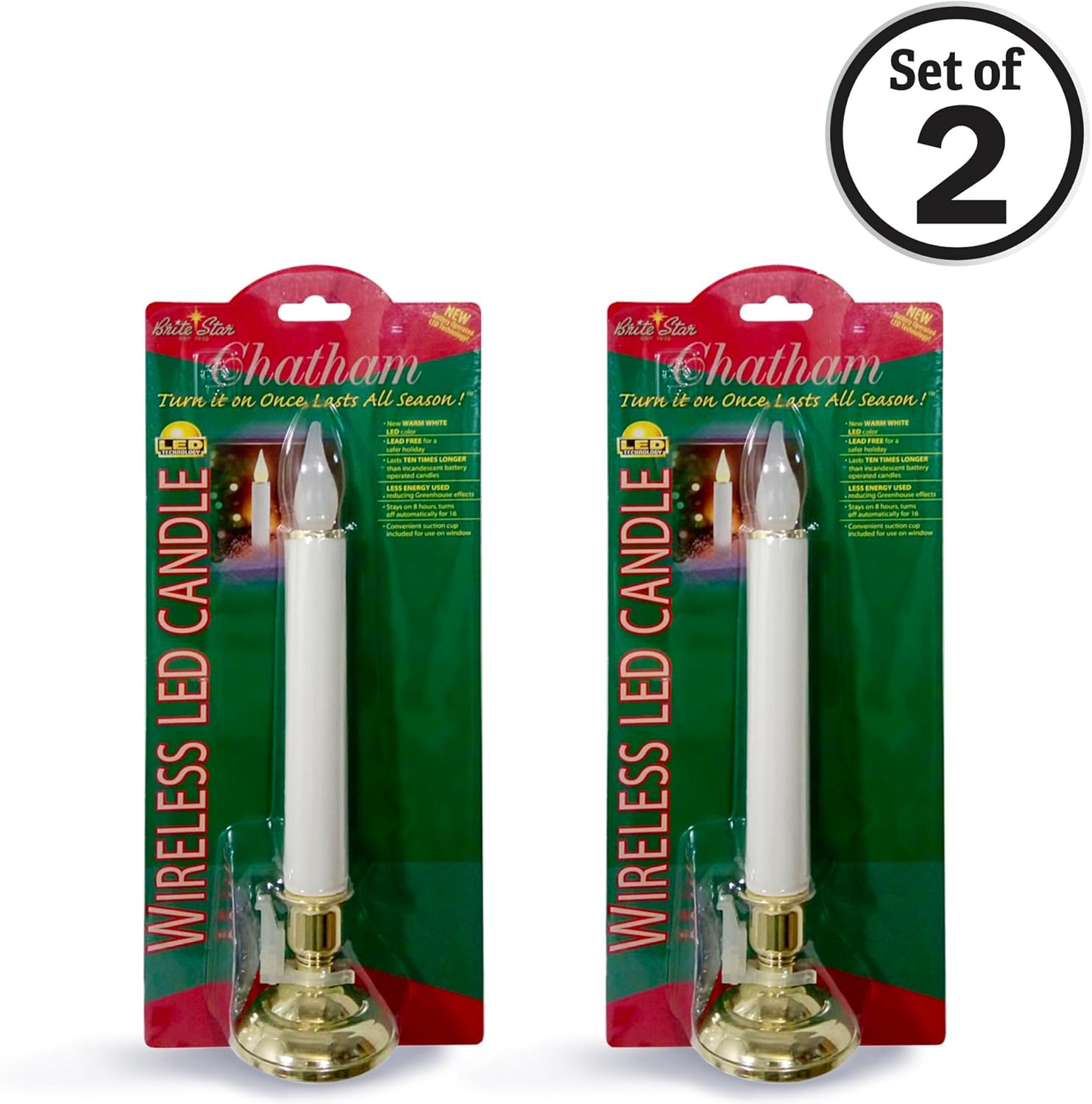 This 2 count of 10" Chatham Candle are excellent addition to any windowsill. The candle glows with a warm white steady burn and its LED bulb saves energy. Each candle also has a shiny gold base and a built in timer. Set it once and it lasts the whole season, 8 hours on and 16 hours off. 2 AA batteries required (not included)