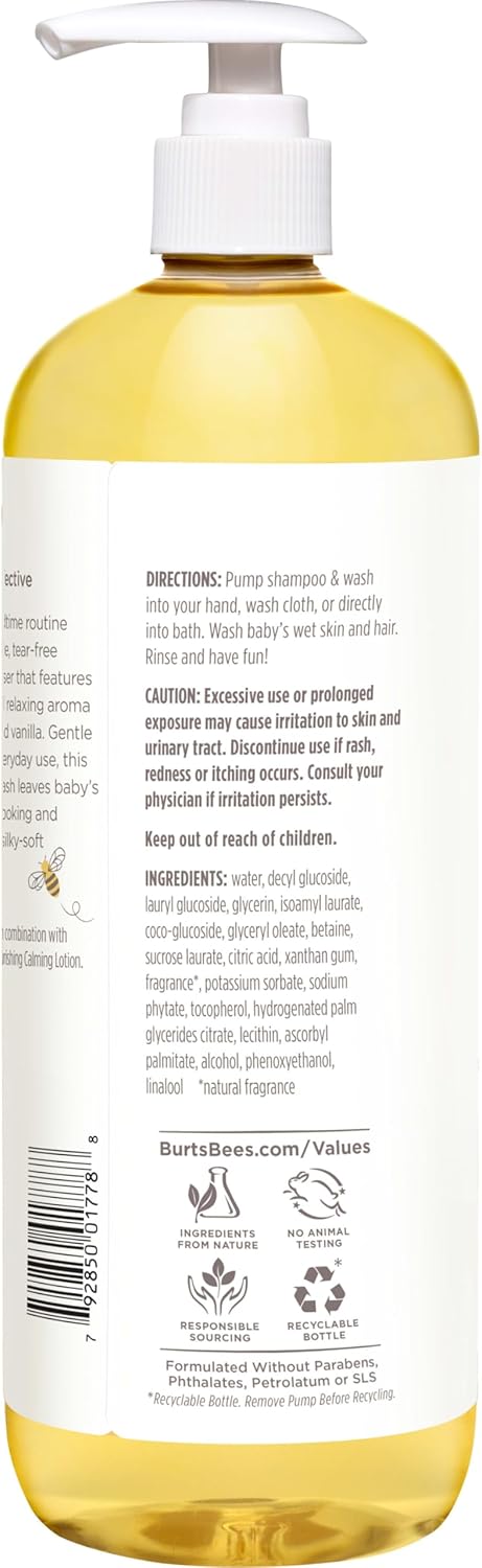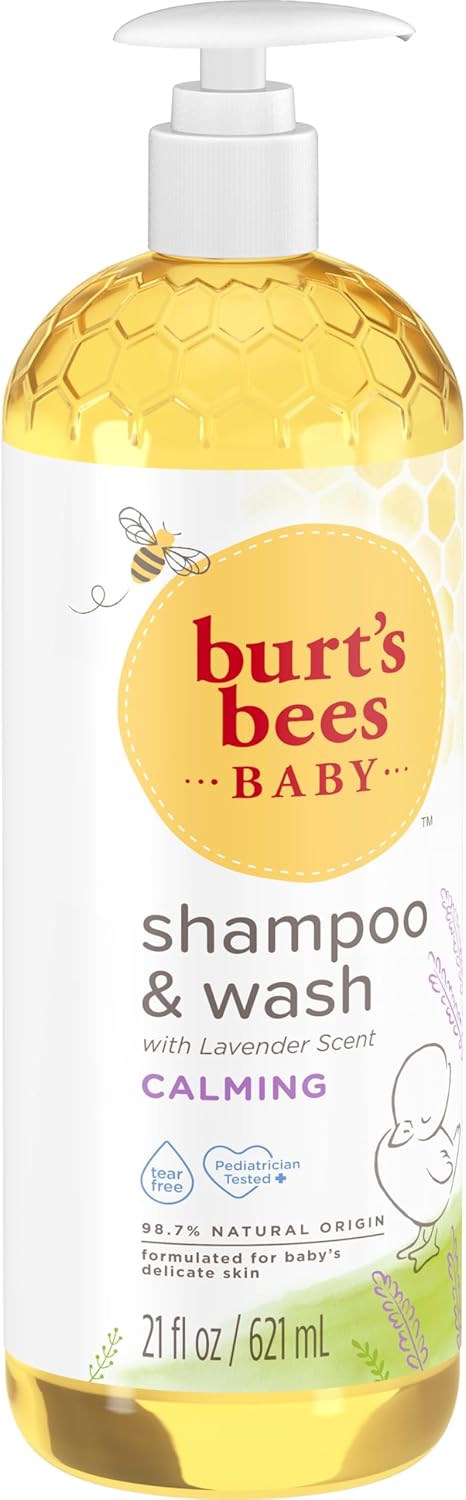 Enhance your bedtime routine by leaving babys skin and hair looking and feeling clean, silky soft and healthy. Burt's Bees Baby Calming Shampoo and Wash is a naturally derived calming cleanser that gently cleans from head to toe, leaving your babys skin and hair looking and feeling silky, soft and healthy. The soothing scents of aromatic lavender and vanilla gently cleanse and calm your baby before bedtime. This 98.7% natural origin, tear-free formula helps relax baby while it cleanses, leaving behind a soft floral scent. Clinically shown to be gentle enough for everyday baby care, this lavender baby wash is pediatrician tested and is formulated without parabens, phthalates, petrolatum or SLS. To use, simply pump shampoo and wash into your hand, washcloth or directly into bath. Wash babys wet skin and hair. Rinse and have fun! Discover all the ways to nurture and protect your babys skin with Burt's Bees Baby Calming Shampoo and Wash.