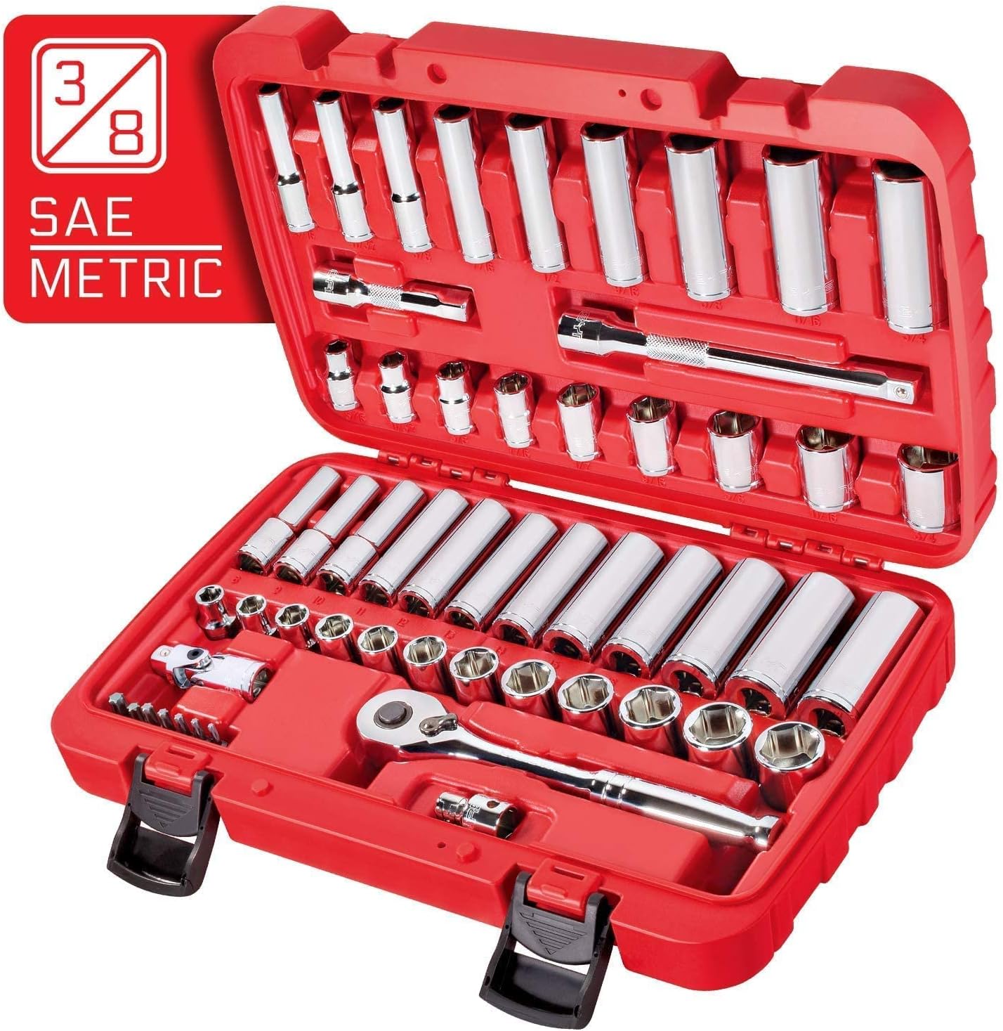 CARBYNE 65 Piece 1/4 inch Drive Socket Set | SAE & Metric, Chrome Vanadium Steel, 6 Point Sockets AND 55 Piece 3/8 inch Drive Socket Set | SAE & Metric, Chrome Vanadium Steel, 6 Point Sockets. Each in Durable Blow Molded Storage Cases. Lifetime Warranty.