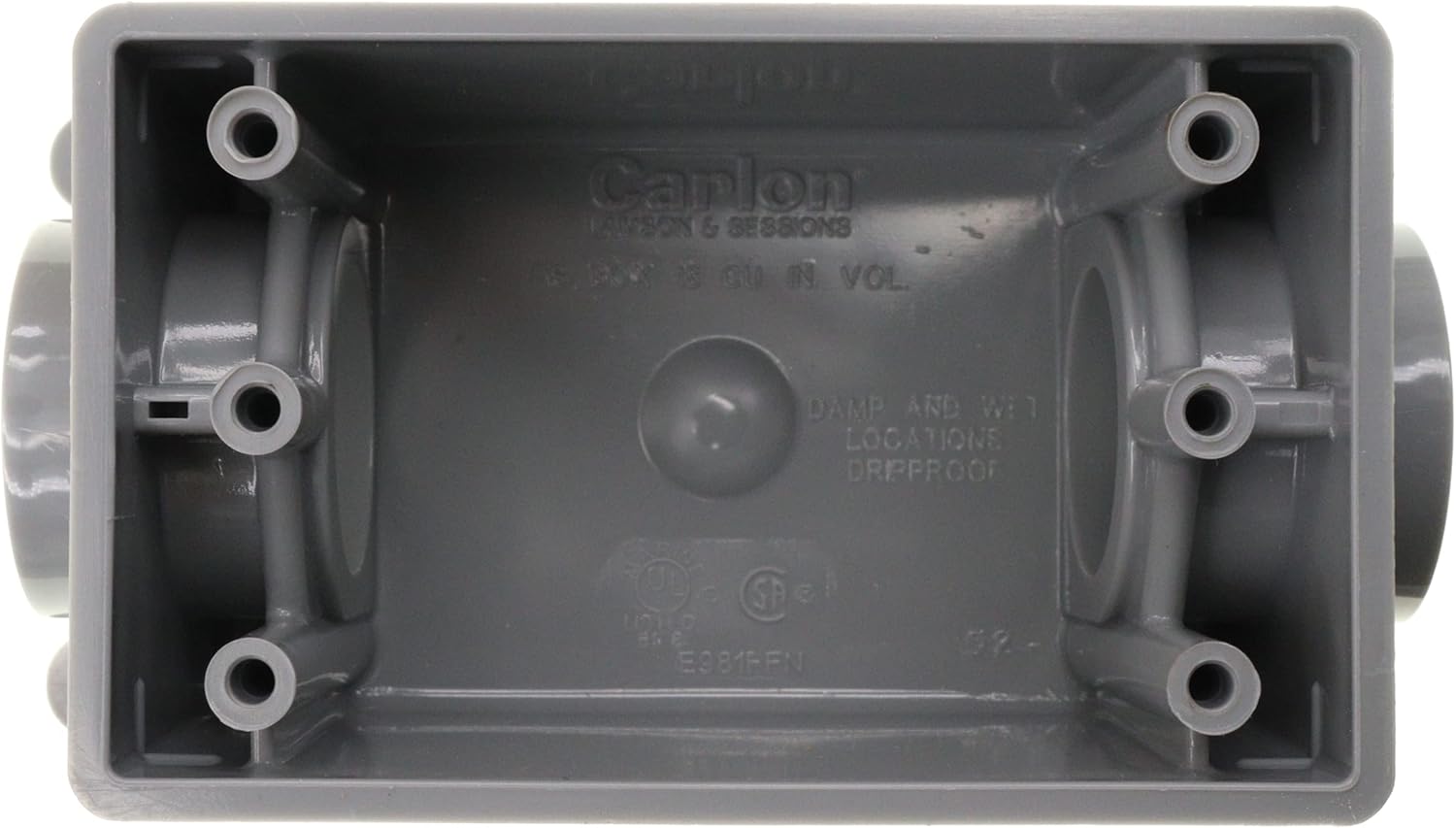 Gangable Type FSC Box; PVC Material; Gray Finish; 4.54 Inch; 2.8 Inch; 2.3 Inch; 1 Inch Hub Size; 2 Hubs; 1 Gang; UL Approval; 18 Cubic Inch Capacity; FSC Style; (1) Each End Hub Location