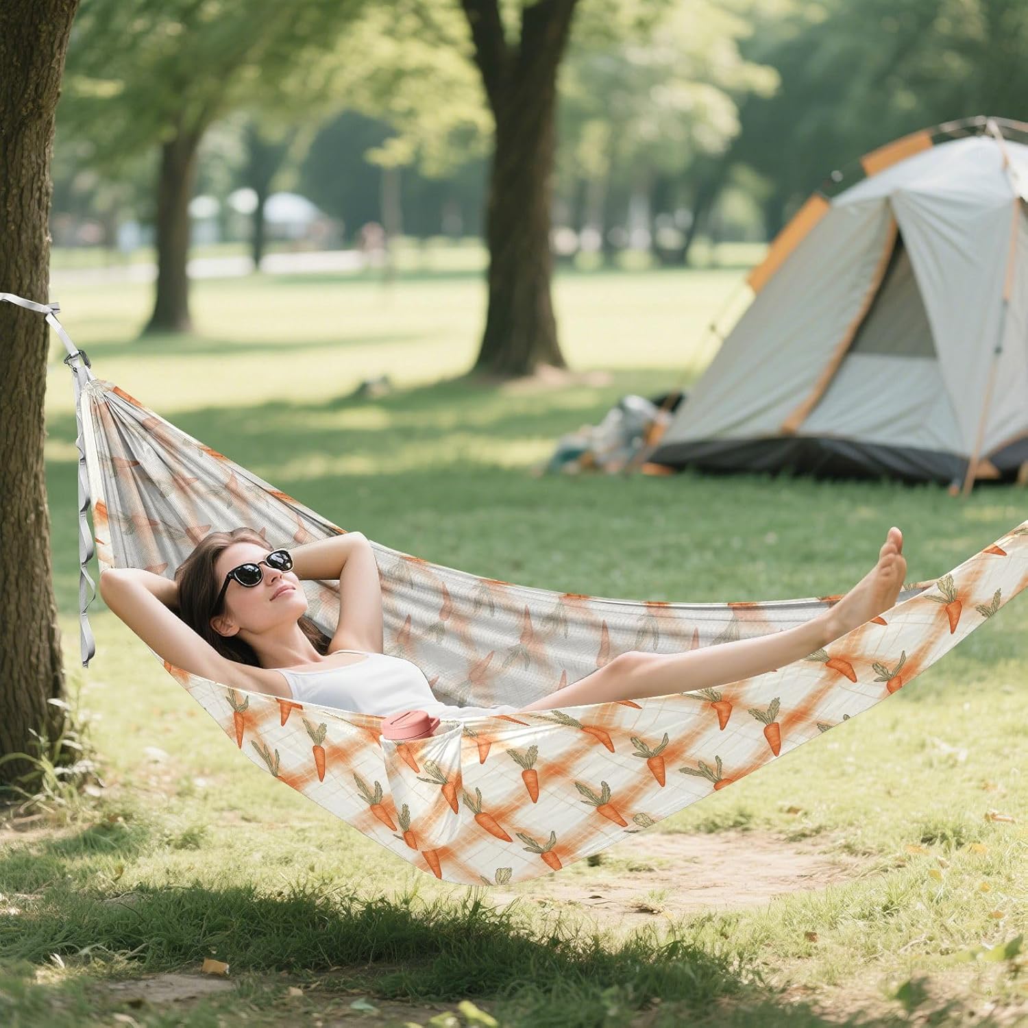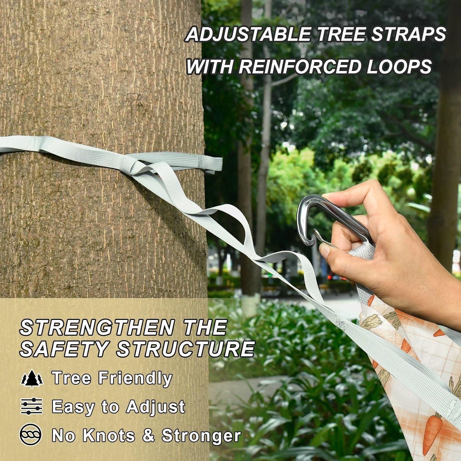 Large Size: 114 × 54.33 in. Although Swing Hammock is used as a hammock, the space is large enough to accommodate two people to rest together. It can bear a load of 330LB/150KG.High Load-bearing Capacity: Fabric Hammock fabric is made of high-strength and breathable 210T polyester. Climbing buckle is made of aluminum alloy. Sturdy, the tree belt is made of high-density 600D imitation nylon webbing, which has excellent wear resistance, tear resistance, and strong load-bearing capacity.Design: This hammock's webbing is equipped with multiple adjustable rings, making it convenient for users to adjust the height and position of Fabric Hammock according to the actual situation. There are also hanging pockets along the edge of the hammock, which can be used to store personal items.Lightweight and Multi-purpose Hammock: Whether you are going camping, hiking, or relaxing in the garden, this Swing Hammock can meet your needs. Moreover, this is a necessity for going camping and having fun.Washing Instructions: Machine washable (Please remove the climbing buckles before machine washing, and store the webbing in a separate laundry bag before putting it in the washing machine). Do not use detergents such as bleach.