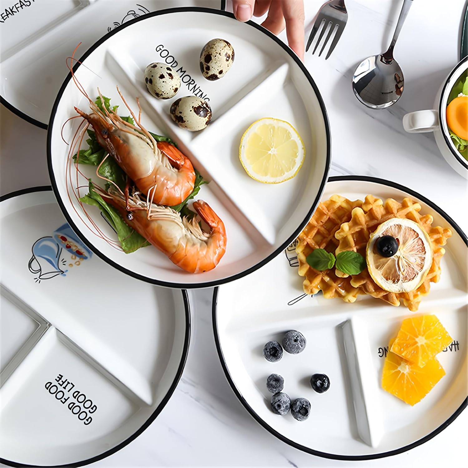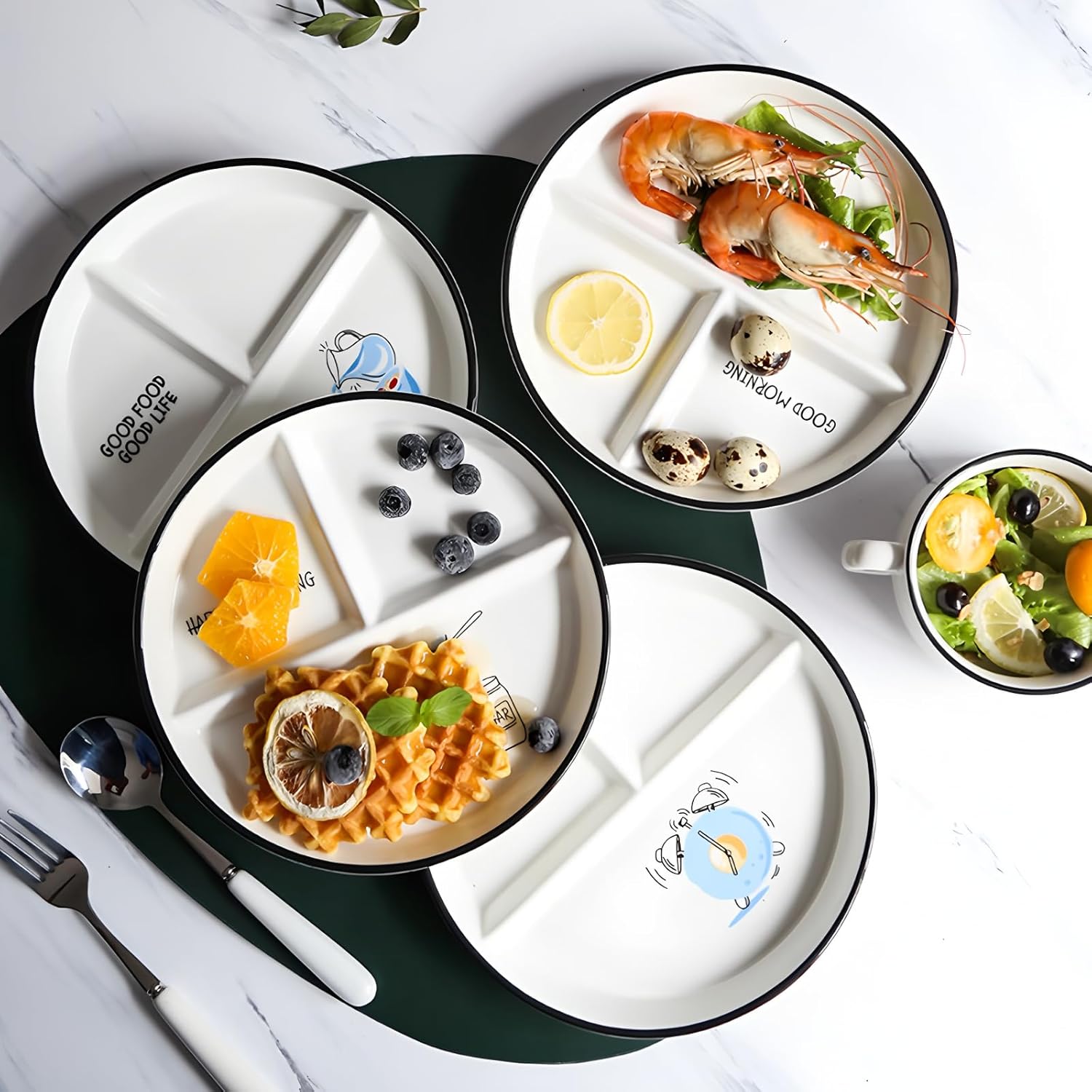 Product Description The ceramic divider plate is elegantly designed with a fine texture that adds a touch of sophistication and style. The base of the ceramic jar is unglazed to ensure a more secure and safe placement without compromising the beauty and functionality of the product. Ceramic compartmentalised plates are classically beautiful, sturdy, practical, reusable and environmentally friendly. The simple colours give a soothing and relaxing visual aesthetic, making it an excellent choice for decoration in addition to normal use. Product Specifications Material: Ceramic Colour: White-Edge black Style: Modern Minimalist Size: 21 x 2.5 cm / 8.27 x 0.98 inch Product weight: 400 g Packaging weight: 600 g Packing List: 1 x Ceramic Divided Plate Care instructions: During the cleaning process, if the storage jar is stained with liquid spots and tea stains, you can choose to gently wipe it with a clean soft cloth dipped in toothpaste. Ceramic products are fragile and need to be protected from dropping from a height when in use. Please use a soft cloth to wipe, because hard objects will leave scratches if you wipe hard, please do not use metal brushes, steel wire balls and other hard objects to wipe.