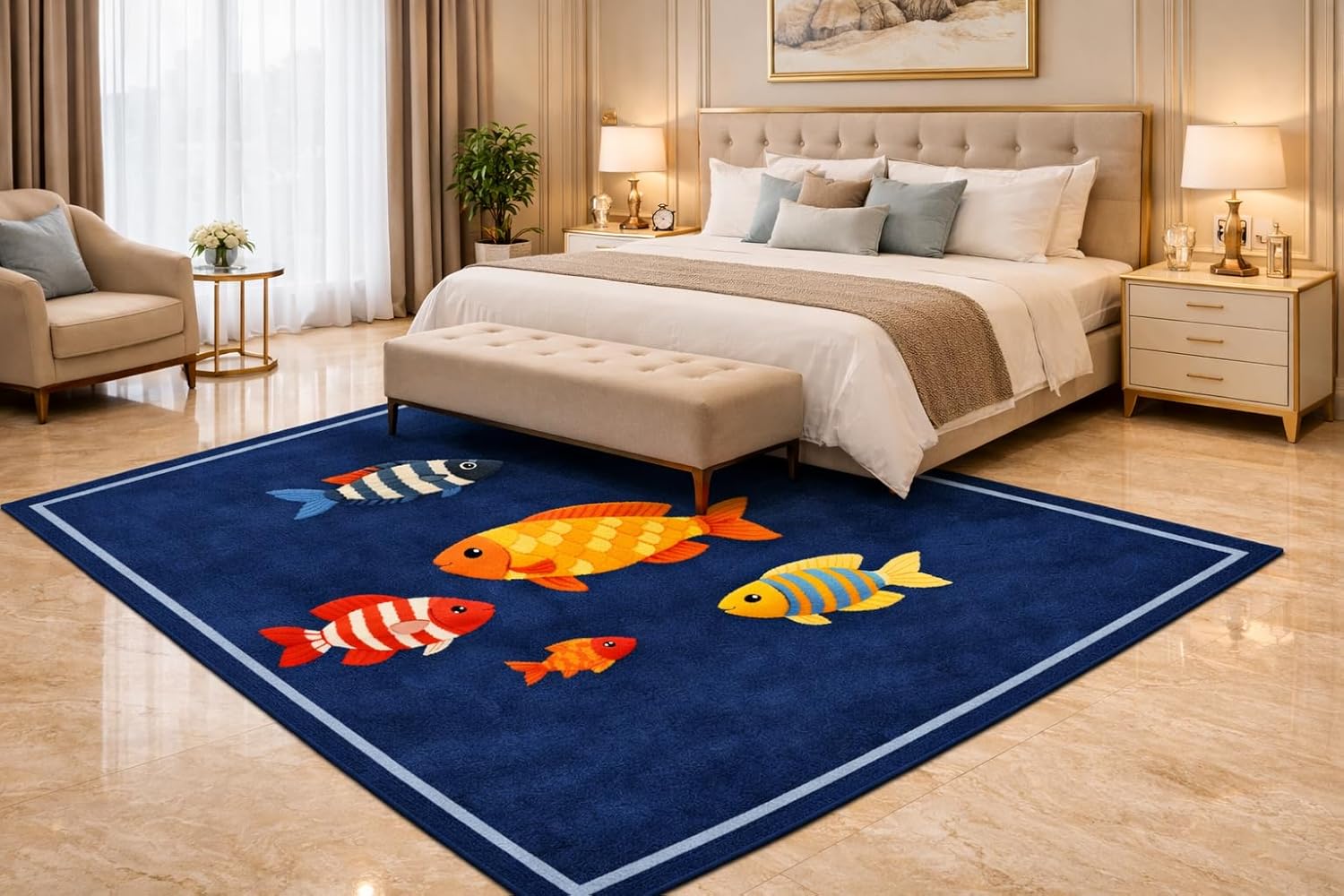 Transform your living space with this enchanting area rug featuring a vibrant underwater scene on a rich green background. The playful design showcases an array of tropical fish in stunning colors - from bold reds and oranges to soothing blues and yellows, each with distinctive stripes, scales, and patterns. This statement piece adds a whimsical touch to any room while maintaining sophisticated elegance. Perfect for living rooms, bedrooms, or any space needing a splash of color and personality. The bordered design with detailed fish illustrations creates visual interest and depth, while complementing both modern and traditional décor styles. The rug's emerald green base provides a striking canvas that makes the colorful fish pop while offering versatile styling options. Whether placed in a grand foyer, cozy bedroom, or elegant living room, this rug creates an immediate focal point and conversation starter. Its artistic marine theme brings the beauty of ocean life indoors, making it an ideal choice for those who appreciate unique, eye-catching home décor.