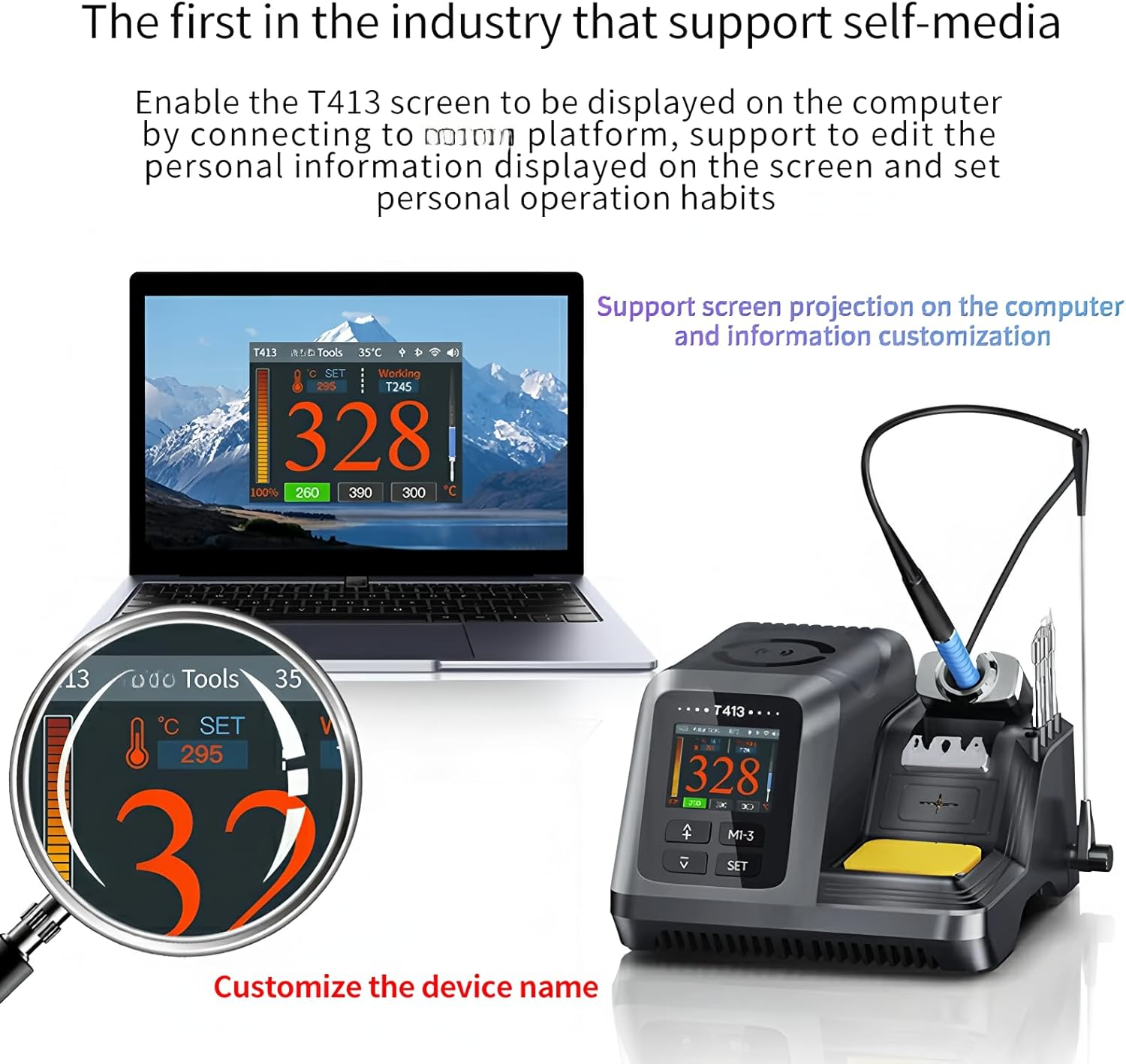 T413 with T245 Handle All-in-One Soldering Station 200W 2.4" IPS Screen AI Voice Control Support OTA Upgrade Intelligent, Networking, Integration Square industrial frequency transformer, 130W rated power, 200W peak power Exclusive neural network temperature control algorithm Compatible with multiple handles and tips Support T245/T225 Handles WiFi+Bluetooth module, support OTA upgrade Self-designed soldering system with 2.4inch HD color screen Built-in temperature monitor system, help the station run smoothly Hands-free innovative metal touch sensor design The first in the industry that support self-media Al Smart Center Control Realize Voice Control Features: T413 Integrated Smart Soldering Station, equipped with an industrial frequency square transformer with a high power rating of 200W. Utilizing an exclusive neural network temperature control algorithm for intelligent temperature regulation, ensuring easier operation. Compatible with T245/T225 handles to meet diverse soldering requirements. Features WiFi and Bluetooth modes, with support for OTA upgrades. Equipped with proprietary soldering system, a 2.4-inch HD color screen, and built-in temperature monitoring system to ensure stable soldering processes. Innovative metal touchpoint design enhances operational convenience, supports computer screen casting, and user-customizable information display. Additionally, supports AI intelligent central control for voice command operation, providing users with a comprehensive smart soldering experience.